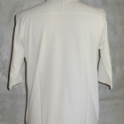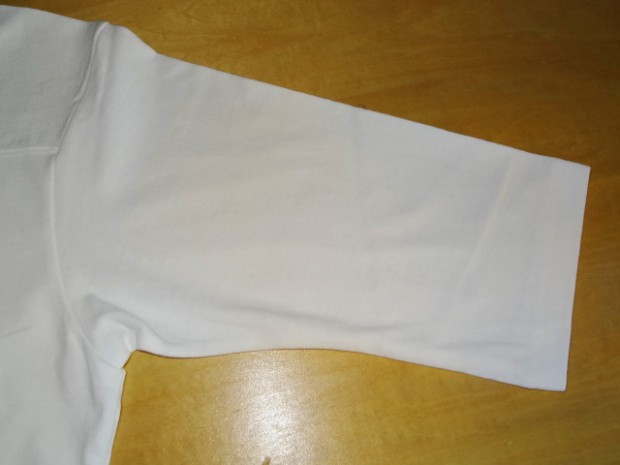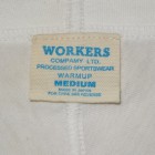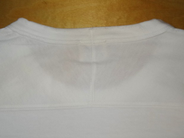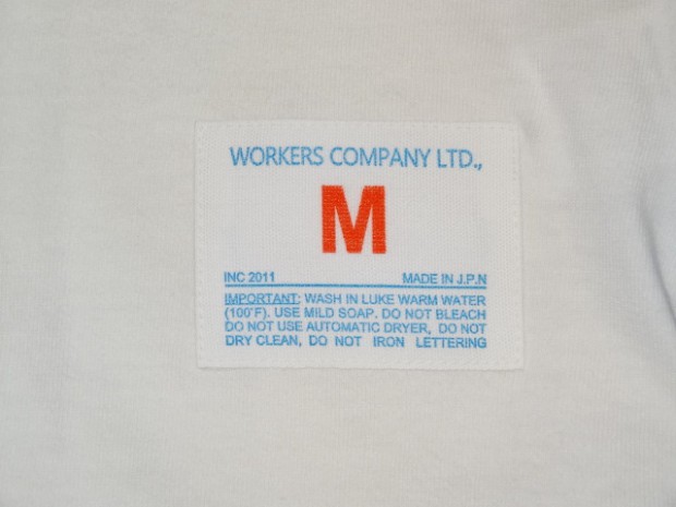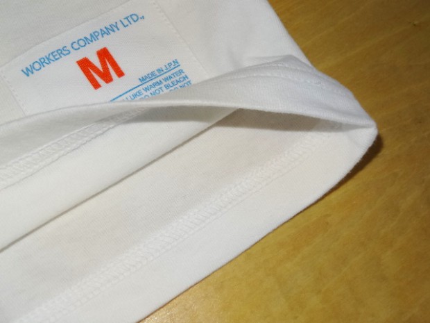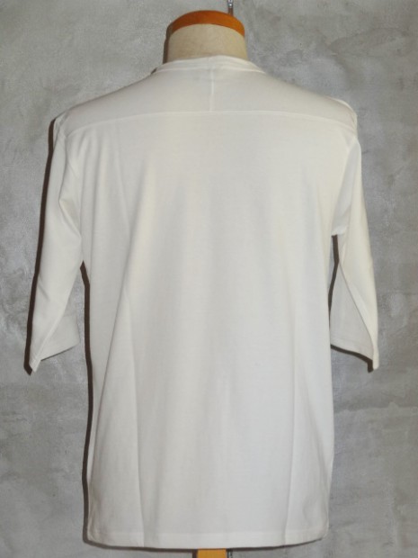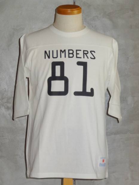 【WORKERS】 別注で作った天竺生地。5.6-5.8オンス程度としっかりした厚みを見ているうちに「これでフットボールTシャツがあったら形崩れもしづらくて良いだろうな」と考え作ってみました。 5月ぐらいから夏場。コーディネートが単調になりがちな時に手が伸びるのがフットボールTシャツ。このシャツは、どちらかというとチノよりもジーンズ。それも少し細身のジーンズに良く似合います。 特徴は肩に縫い目が無い事。胸と背中、横方向に切り替えを入れることで肩縫い目の無いヨークパーツを作ります。これを、前身頃・後ろ身頃とつなぐ。このつなぎも、ただオーバーロックでつないだだけだと胸に縫い目があたり気になります。そこで、二本針の扁平縫いでオーバー縫い目をつぶしフラットに。ネックは少し太めのバインダー。パイピング状に身頃を食い込んで縫うのである程度生地に厚みができネック周りがしっかりします。