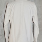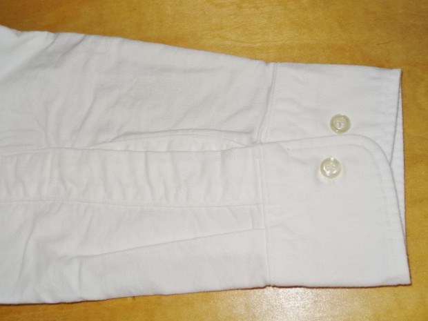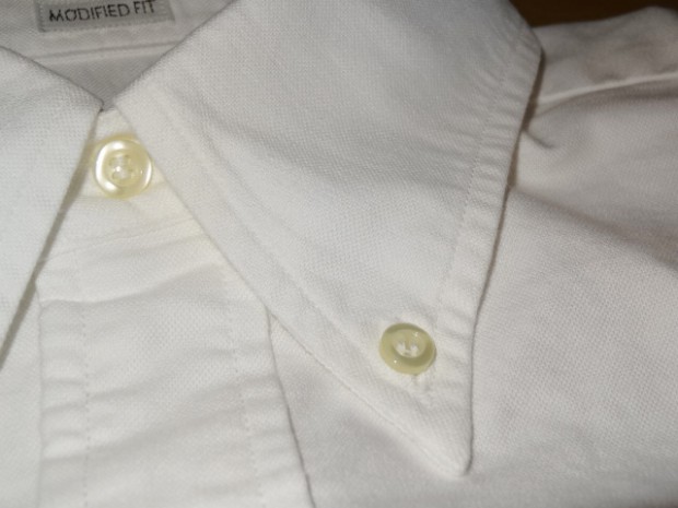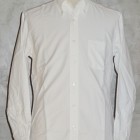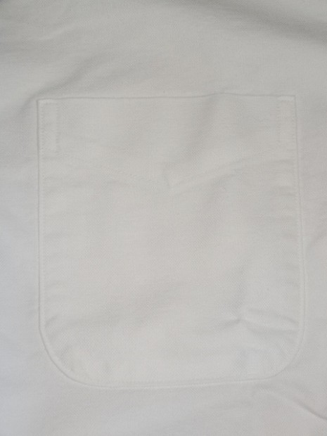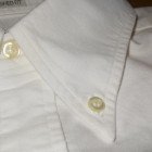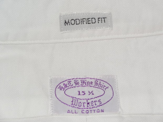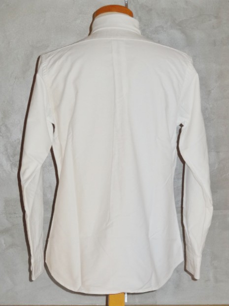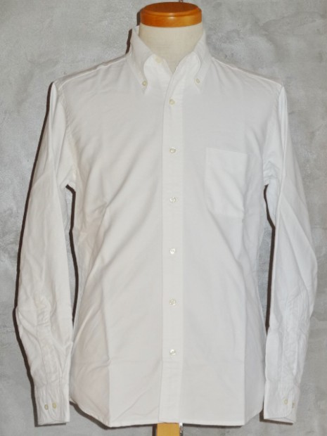 【WORKERS】 ベーシックなボタンダウンを2シルエットで。 ModifiedFitは定番で適度にフィット感のある現代的なシルエット。ただ、 襟は現代的小襟ではなく、あくまで「フルロール」の出る8センチ程の羽襟。首のボタンを締めた状態ではぺったりとし たボタンダウン位置。首ボタンを開けて初めてゆったりとしたロールが出ます。中には極薄い、水溶性芯を。洗うと、芯 の糊がはがれフラシ芯になります。 素材は、今から10年近く前、某Dリバーがクローズ!という時にデッドの1枚を買って解体し、糸番手・打ち込みを調 べ作った物。タテは40番の二本引き揃えに対し、ヨコが16番の双糸。16番を二本よって8番クラス、かなり太い糸で織っ たヘビーオックス。オンスも6.5オンス程。製品はOW済み。