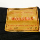 【WORKERS】 Lot802,Slim Taperedでおなじみのシルエット。ジャケットにも合わせやすいすっきりしたシルエット。でもタイトすぎて動きづらい、着づらいとも違う、調整を重ねたゆとり・寸法。そのシルエットをできる限り再現したピケパンを作りました。 仕様はあえて、802と同じ革ラベル、フロントボタンフライ。脇はミミが無い生地なのでオーバーロック+割り。カラー物のパンツはとにかく合わせやすさがポイント。シャツ・ジャケットはもちろん、もっとカジュアルにスウェットやボアジャケットと合わせてもOK。地味ですが、あると絶対に役に立つ一本。素材のピケは厚みが11オンス程度。真夏はともかく、秋から春まで。季節を問わずに履くことができます。色は真っ白より、少しだけ色が入ったホワイト。何にでも合わせやすいベージュ。ブラックはどちらかというと、カジュアルに。スウェット+ボアジャン+スニーカーといった組み合わせはどうでしょう?古着で探すと、この黒が中々無いのです。製品はOW済みです。