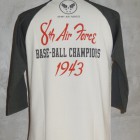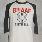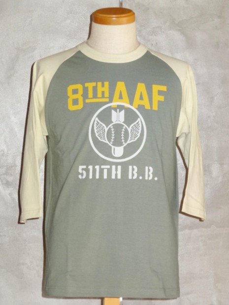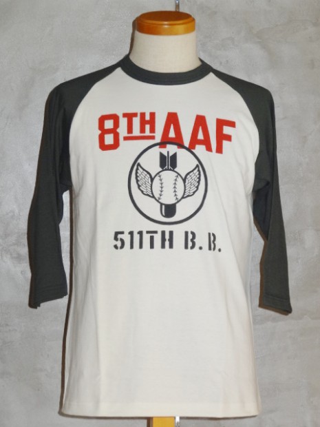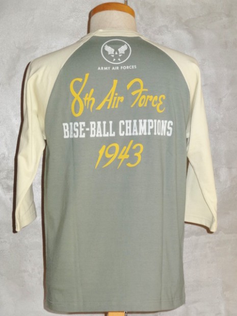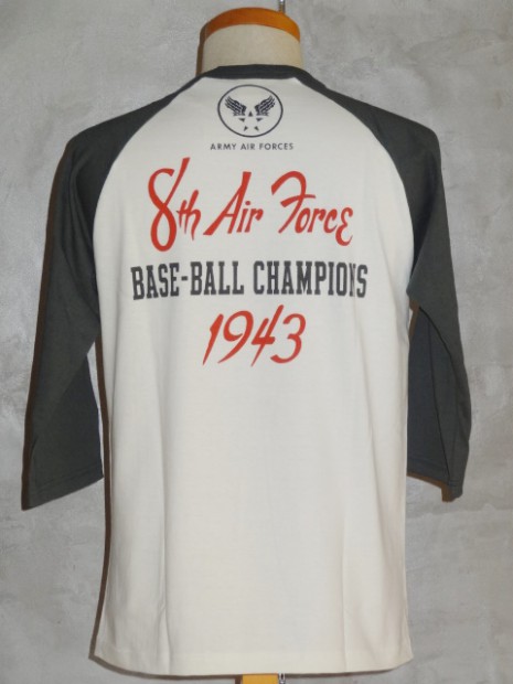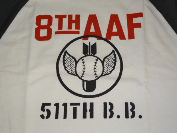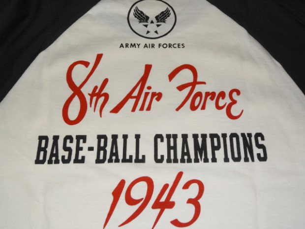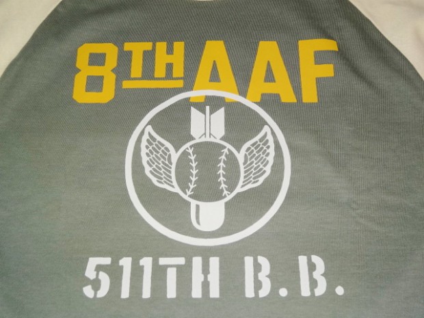 【TOYS McCOY】 明日の命も知らぬ戦場で平常心を保つのは故郷で楽しんだボールゲームの興奮。信じられないことに欧州戦線が激戦の最中、第8航空群では野球大会が催されていました。その大会に掲げられたサインと、ボールボーイスコードロンをプリントしたラグラン丈の6分丈ベースボールシャツです。