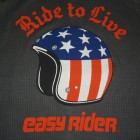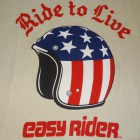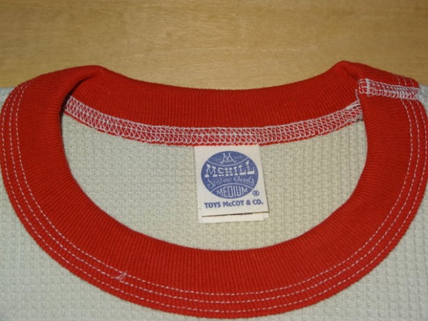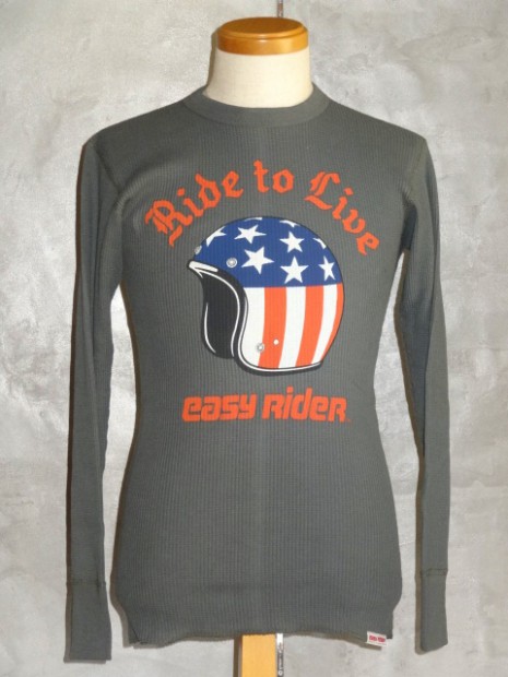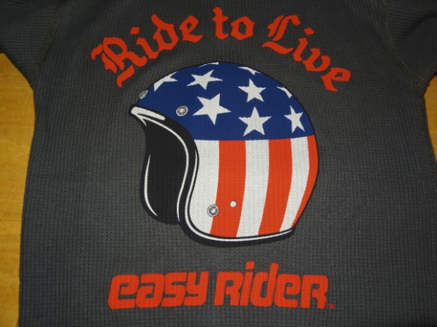 【TOYS McCOY】 ピーター・フォンダ演ずるワイアットのコスチュームとして忘れられないのが、小さなガソリンタンクと同じく、星条旗柄をペイントしたヘルメットでした。以前、かつて復刻も遂げたそのヘルメットの細かなディティールまで描いたイラストを胸にプリントしたサーマル・ロングスリーヴTシャツです。