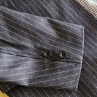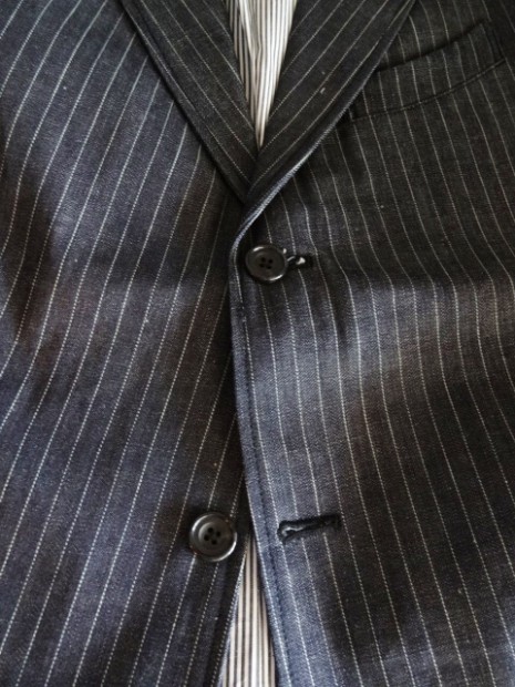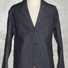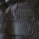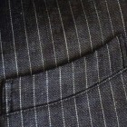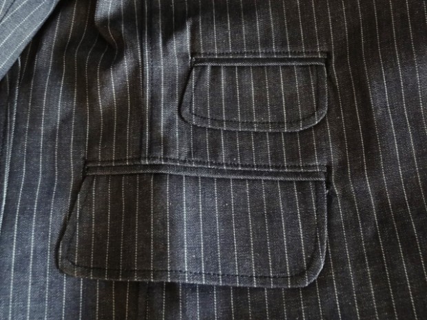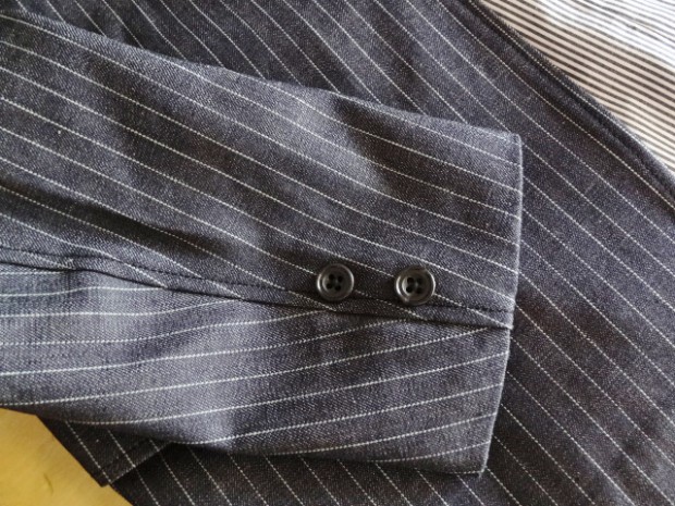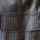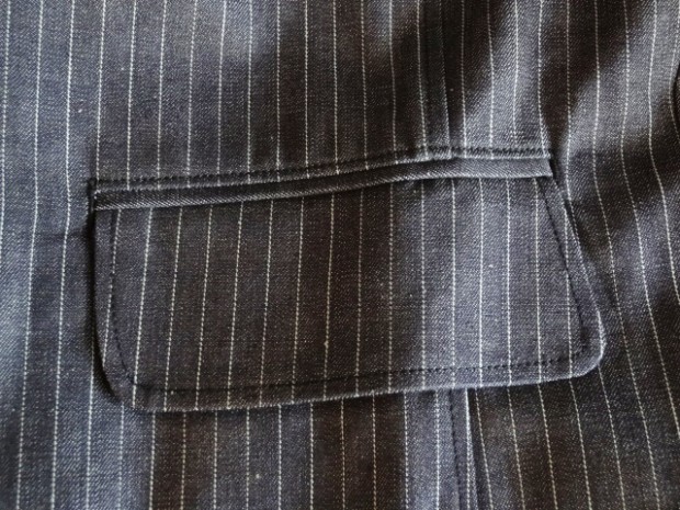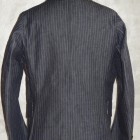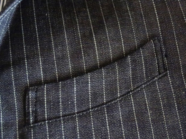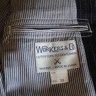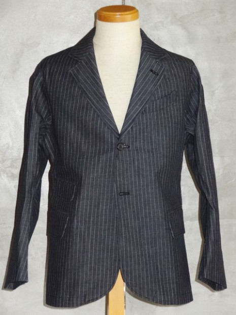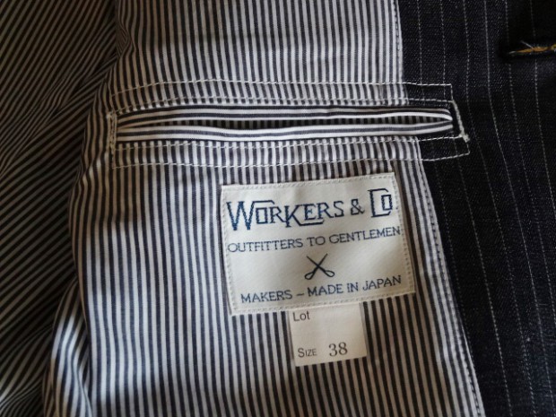 【WORKERS】 今年のWORKERS、裏付ジャケットは二つボタン。ボタンの位置がポイントで、真ん中ボタンを一つかけてちょうどみぞ おちのあたり。下のボタンはかけないほうが裾が綺麗に落ちます。デザインはチェンジポケットあり、胸の箱ポケットはちょっとカーブを付けて。3パッチやパッチ&フラップ+胸箱といったアメトラ定番デザインとは違う、もう少しクラシカルなデザインに。 素材、デニムのタテ糸に一部白糸を使ってストライプを描いたもの。デニムというとラフな素材ですが、クラシックかつクロージング的なストライプとあいまって、かなり落ち着いた印象。Workers Officer Trosuersがセットアップになります。身頃裏はコットンのシャツ生地、袖裏はすべりの良いキュプラ。 WORKERS のジャケットは着丈が長すぎず、肘から先がすっきりしたシルエット。カジュアルでも合わせやすく、かといって細すぎる・カジュアルすぎるとならないよう、バランスを取っています。