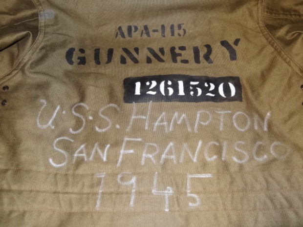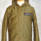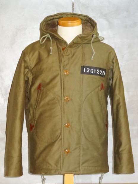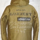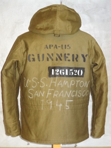 【COLIMBO】 1920年代から各国軍はWW1での経験を生かし様々なミリタリーウェアに適した素材の開発に取り組んでいました。冬季の冷たい外気から兵士を守る素材の研究も盛んで米軍ではアルパカ・ウールをライニング材に使用することで当時最高のサバイバビリティを発揮し、積極的に導入を進めていました。本モデルはWW2当時のパーソナル・バーチャスモデルをベースに制作しており、その特徴的なフード周りのディティールや、生産当時も後からモディファイされることの多かったウェストのアジャスト機構などを余すことなく再現してあります。また、TALON社製ファスナーにはコットンテープを使用しておりますので、必ず差し棒が一番奥まで差し込まれていることをご確認の上、ゆっくりと引き上げてください。 本製品は攻撃輸送船ハンプトンの乗員着用のイメージで当時と同様のカスタムを施しています。デッキクルーに許されたカスタムはクルーの指名、または愛称、IDナンバー、所属班(製品は砲術班)、フリートNo.及び作戦名などに限られ、同時期のフライトジャケットカスタムの様な華やかさはありませんが、彼らの任務に対する情熱や闘志が伝わってきます。ペイントは白、黒、グレーといった戦艦艇で使用する備品をくすねてシンナー代わりのアルコールなどで希釈してことによるペイントの変質や過度に薄めたことによる文字の乱れやボヤけなども再現しております。また、手描きの部分はオイルスティックによるもので着用及びクリーニングの繰り返しにより徐々にフェードアウトしていきます。