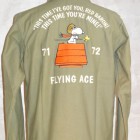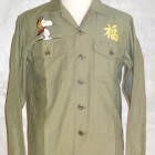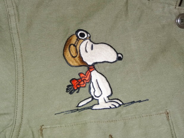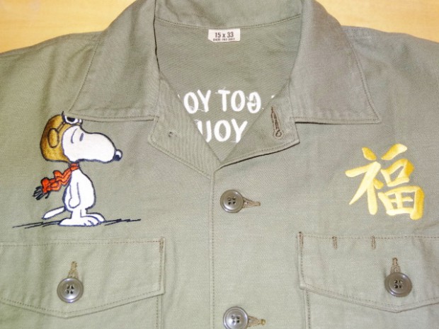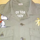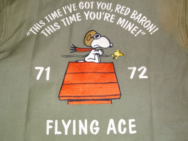 【TOYS McCOY】 コットンサテンを用いたユーティリティシャツ(基地内の作業などに用いられる汎用ウェア)を復刻し、スーヴェニアジャケット(通称:ベトジャン)スタイルの直刺繍を施しました。背面と右胸には。オフィシャルライセンスの元、スヌーピーの刺繍を施しました。本作はスヌーピーが戦闘機パイロットに扮し、第一次大戦の独撃墜王リヒトフォーヘン【レッドバロン】との対決を夢想する1コマをモチーフにしています。