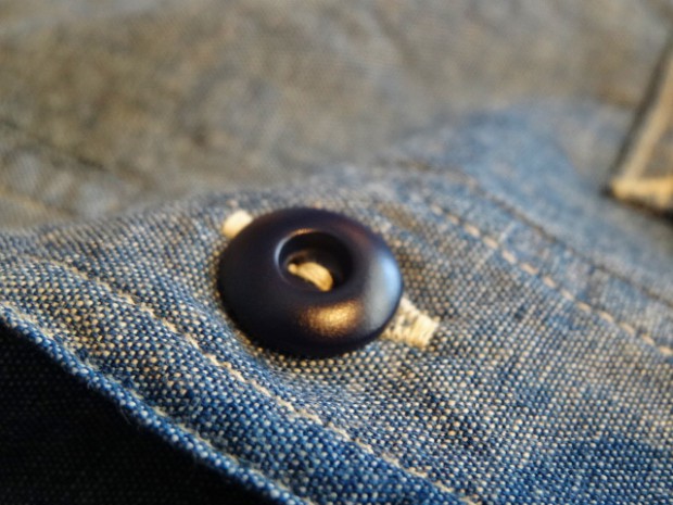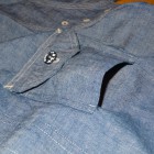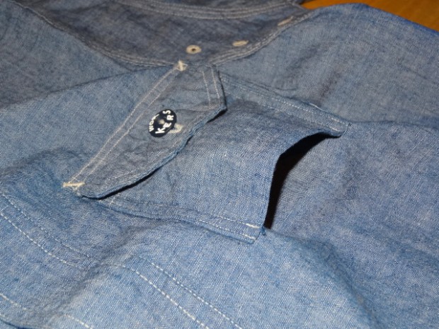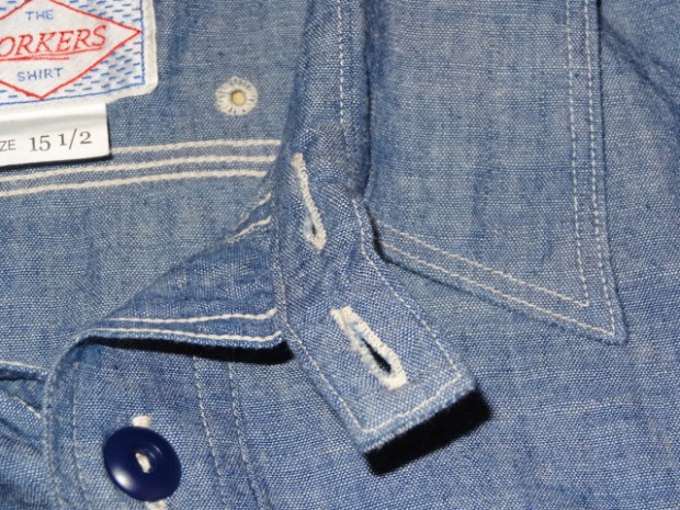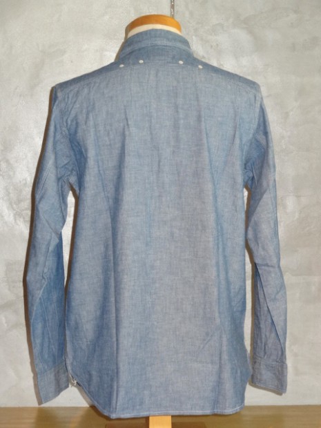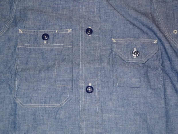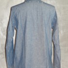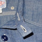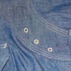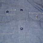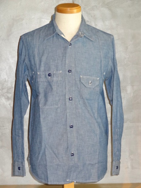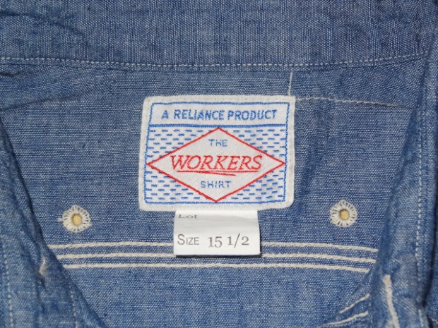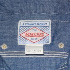 【WORKERS】 Reliance社の特許イラストでおなじみ、シガレットポケットワークシャツ。久しぶりなので豪華に。 フロントアームホールに三日月形補強布。バックは通常のヨークですが、こちらも通気孔をあけています。 Reliance社は様々なワークウェアを作っていましたが特にワークシャツは力を入れていました。新しいアイデアが特許を取れたら報奨金!といった当時の広告が残っていることから、ワークシャツに何か新しいアイデアを!と模索していたようです。 シガレットポケットは、身頃からポケット裏が浮いているのでタバコが湿気ないという機能。ただ、現代のたばこは大きすぎて入らないのでデザイン的に。さらにこのポケットには刻印入りの金属ボタン。他の部分もすべて金属ボタンで、いかにも強固なワークシャツらしい部品。 素材は定番の5オンスシャンブレー。普通に洗って着れば強烈に色落ちします。 製品はOW済です。