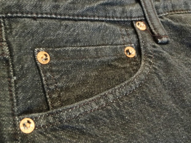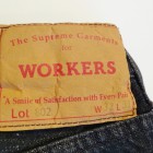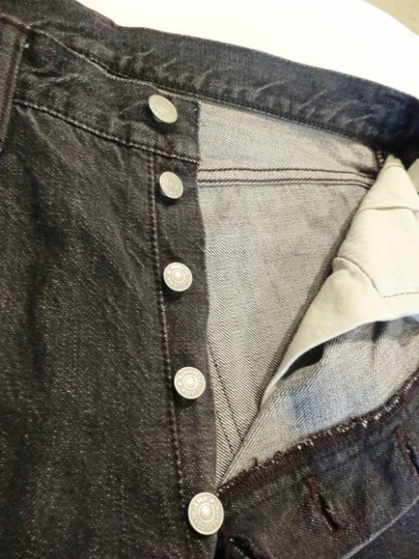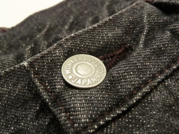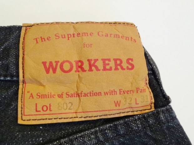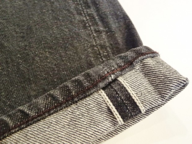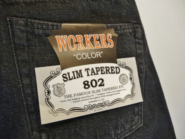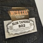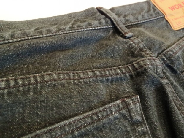 【WORKERS】 インディゴ・ホワイトと来たWORKERSの作る「綿(ワタ)からデニム」。シリーズ第三段はブラックジーンズです。 数年前、たまたま見たコーディネートでブラックジーンズ+ハイネックニット+ジャケットがありました。それ以来「ブラックジーンズはジャケットに合うのではないか?」とアイデアを温めてきました。 ただ、ブラックデニムは問題が一つ。ホワイトデニムと同じく、?糸を染める ?染めた糸を織り機にかかるよう巻くため別の場所に持っていく。この時も小分けに巻きなおす ?別の場所で織機にかかる状態にする(サイジングという工程)、これらの工程を別々の場所で行うのでインディゴデニム以上にコストがかかる。莫大な量があれば、インディゴデニムと同じ「ロープ染色」という上記三工程を一つの工場で行う方法もあります。生地屋さんが莫大な量を作ってコストを抑えたブラックデニムを使うことも頭をよぎりましたが、それではWORKERSのブラックデニムに成らない。初志貫徹、メーター単価が高くてもWORKERSの糸を使ってブラックデニムを作りました。(価格はもう無理やりです) ブラックデニム、OWではあまりインディゴと差がわかりません。そこで、加工物を追加。これで、セルビッジのがたがたとしたアタリが良くわかります。ミミ付デニムでこその色落ち。縮み・捻じれに対する加工をしていない、毛焼きも無い生機(キバタ)生地。ステッチ部分に出たデコボコ、捻じれた脇の縫い目がポイントです。