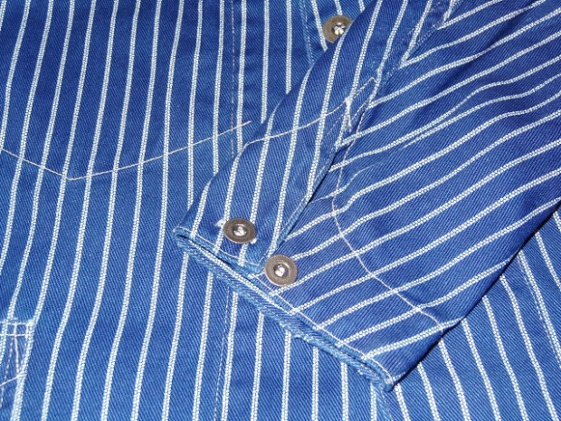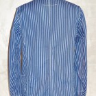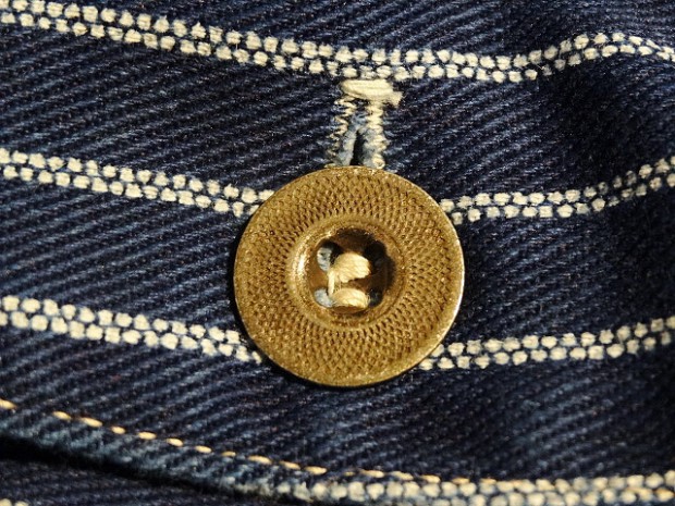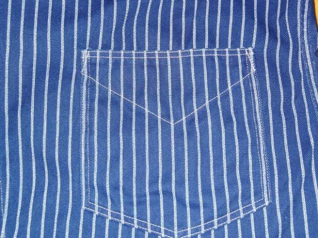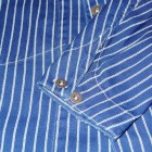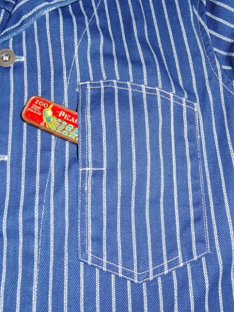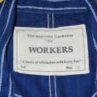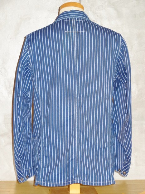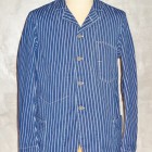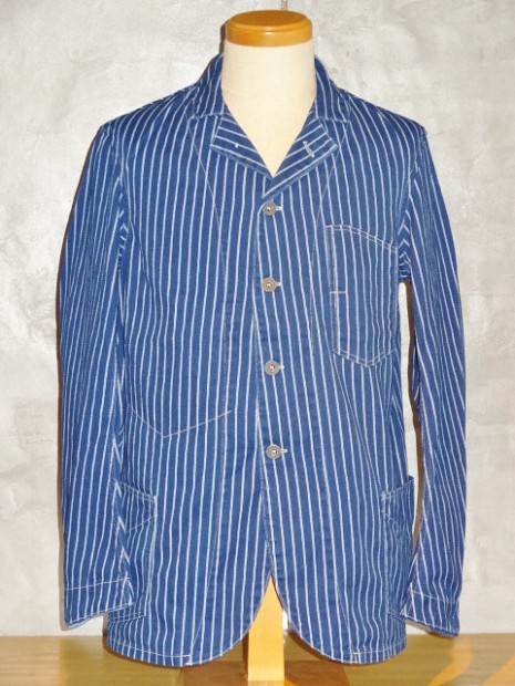【WORKERS】 こちらも古くからのWORKERSファンにはおなじみ、ヘッドライトのアド(広告)写真から作ったカバーオール(レイルロードジャケット)。 今回はより、ジャケットに近い形にアレンジしています。襟を少し小さめに、ラペルとのバランスがよく、いかにもクラシックなSackCoatのように。ポケットは左胸にウォッチ+ペンのコンビネーション。右胸は表にポケット無し。内ポケットに。腰は大型のポケットを左右、脇よりにつけています。 ボタンは糸付けの金属に。柄が入り、さらにそこに黒系のメッキがべったりではなく落ち気味のものを。 素材はOverallと同じく、10オンス程のインディゴ抜染生地。新たに柄を起こしたダブルドット。世の中、ワークウェアブームだったので久しく作っていませんでしたがやはり良いものは良い。Lounge Jacketや今期で言うとCreole Jacketのような、トラッド的なジャケットとはまた違う。ワークウェアの範疇にいるジャケット。私は俗にこの手のをSackCoatと呼んでいます。同じジャケットでも、このラフな風合いを着たいときがあるのです。着て、洗って、生地もステッチも風合いが出てくる。そんなSack Coatです。製品はOW済です。