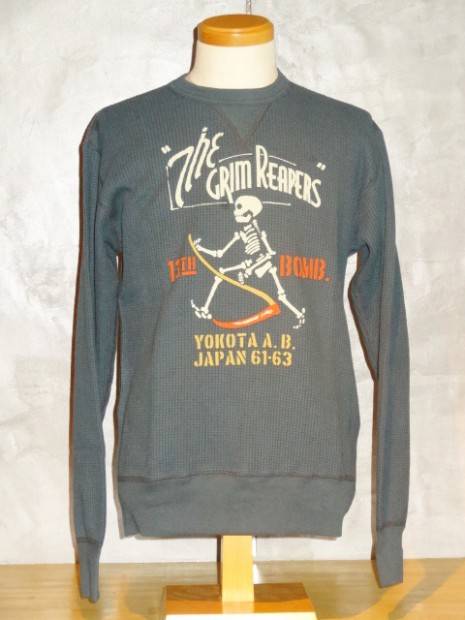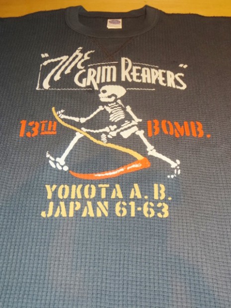 【TOYS McCOY】 血まみれの巨大な鎌を持つ死神”グリムリッパー”を象ったスコードロンマークをもつ米空軍第13爆撃飛行隊。その不吉な部隊章とスカル&ボーンズをプリントしました。同部隊は第一次大戦から今も現存する最古の飛行隊の一つです。