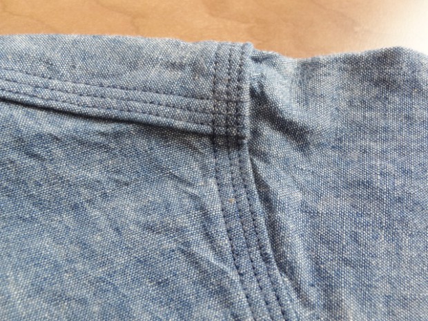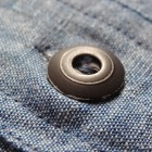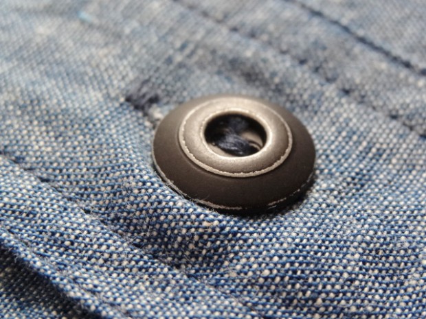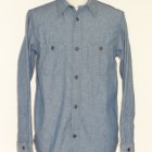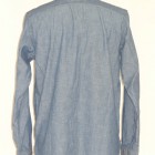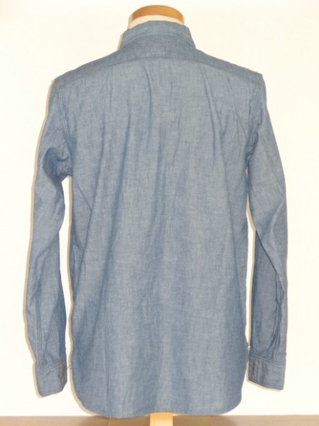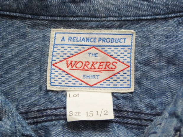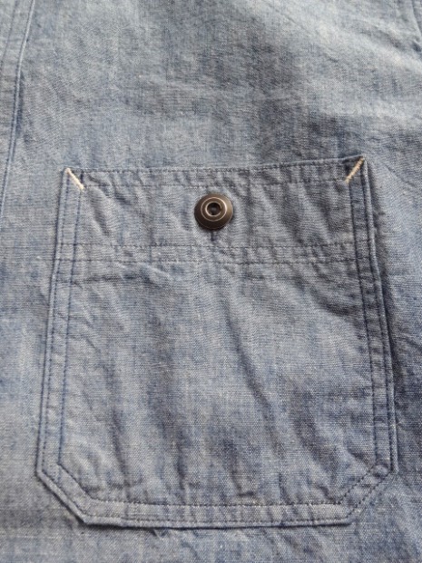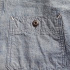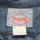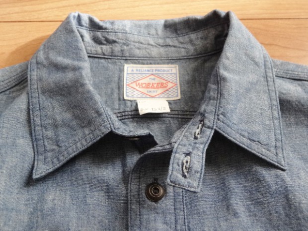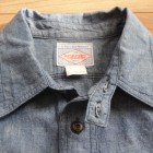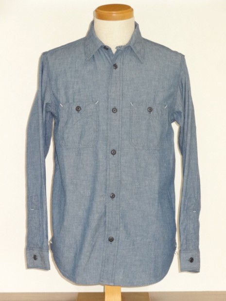 【WORKERS】 とても細かい目の綿糸によるステッチがリアルにビンテージ的な表情のワークシャツ。型紙もタイトにせず、本来のワークシャツらしさを目指しました。 ポイントは別注したボタン。ボタンワークスさん謹製のメタルボタン。メタルボタン、以前から豪華ワークシャツには取り入れていましたが、塗装の質が良いので洗ってもそう簡単に色が剥げない。以前、他ボタンメーカーですぐはげるものを使っていて「さすがにこれは・・・」とご指摘もあり強度のある塗装にしているのですが 「せっかく着こんでもボタンは新品みたいですね」 と言われることも。そんな時に、ボタンワークスさんが「通常の洗濯ではそう簡単にはげない、でも、加工をすることでしっかりビンテージのように色落ちしたボタン」を開発してくれました。 ボタンにリアルなビンテージらしさがある分、デザインはシンプルに。ガチャポケやロゴボタンを使わず、素材・パターン・縫製の良さがストレートに伝わるよう目を引くデザインはあえて入れていません。 ブルー・ホワイトは定番のミミ付シャンブレー。洗いこむごとに風合いが変わります。 製品はOW済です。