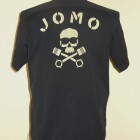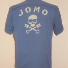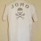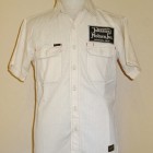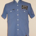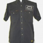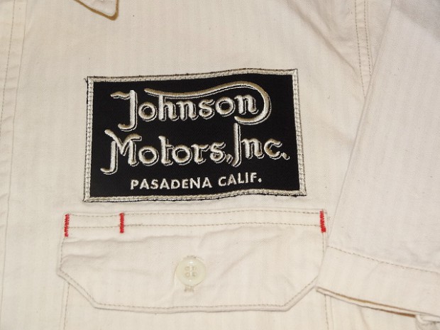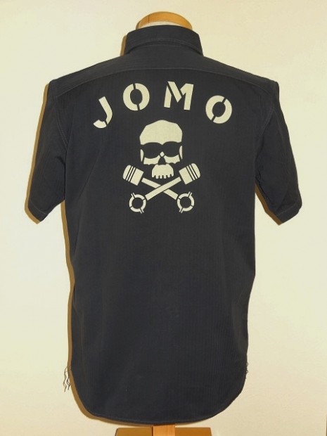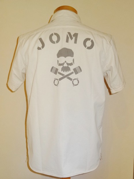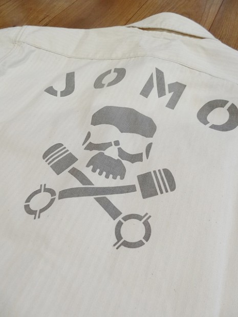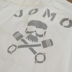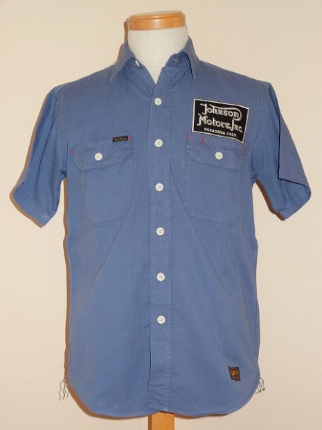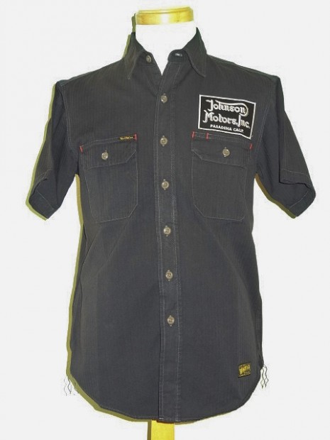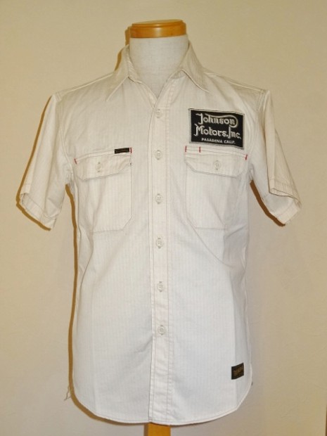 【トイズマッコイ】 ヘリンボーン ワークシャツ ”JOMO” ヘリンボーン素材を用い、フラップ付き胸ポケットを配したシンプルなショートスリーブ・ワークシャツをベースに左胸にジョンソンモータースの刺繍パッチ。背面にはコーチジャケットと同じ、スカル&ピストンをプリントしました。