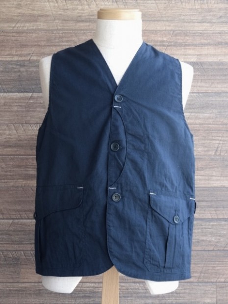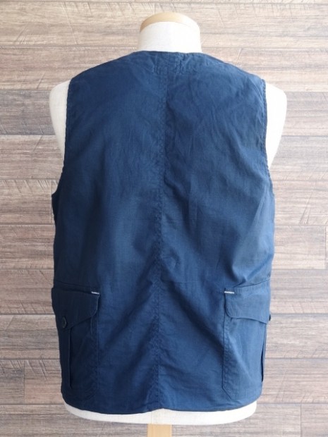 【ワーカーズ】 クルーザーベスト ネイビー コットンリネン クロス 息の長い製品になったCruiser Vest。ビンテージのハンティングベストをデザインソースに、街着として着やすい素材・サイズ感にアレンジしています。 腰の大型ポケット、フロントの三日月型ポケット、内ポケットが左右に二つ。フロント・バック共に裏地付。本来、 ハンティングで獲物を入れたり、道具を入れて両手をあけるための「道具服」。これを着やすい素材で作りバッグ代わりに。 19SSでは左右非対称デザインを取り入れました。腰ポケット、左側はおなじみの大型ポケットを真ん中で二つに分けたもの。右側はその大型ポケットを真ん中で分けず、大きな一室としたもの。入れる人はいないでしょうが、クレ556 の 缶がそのまま入ります。フロントの三日月も左身頃側のみ。左利きの人には申し訳ないのですが、右利きの場合入れるのは圧倒的にこちら側が多いのと、全体的に左右非対称のデザインで統一したかったため。携帯、メモ帳、財布、すべてこ のベストに入ります。 素材、ネイビーはコットンリネンの平織り生地。3.8 オンスと軽い生地を表地・裏地の二重使い。軽い生地でも二重使いなのでペラペラした感じはありません。 製品はOW済です。