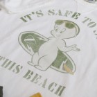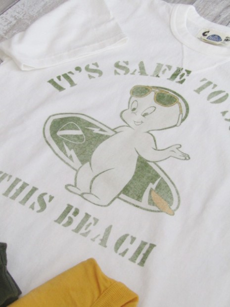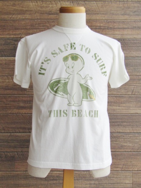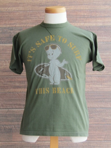 【トイズマッコイ】 ミリタリーTEE キャスパー " IT'S SAFE TO SURF " 愛らしいキャスパーを起用したイラストですが、サーフボードに見覚えがあればかなりの映画ツウです。第1騎兵師団のインシグニアをペイントしたボードは映画『地獄の黙示録』のキルゴア中佐のもの。イラストと共にプリントされた台詞も判る人には判るあのシーンから。