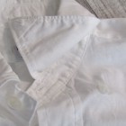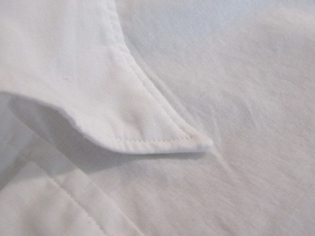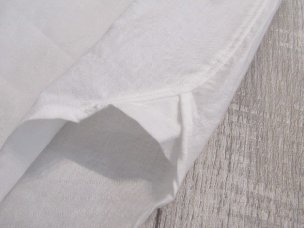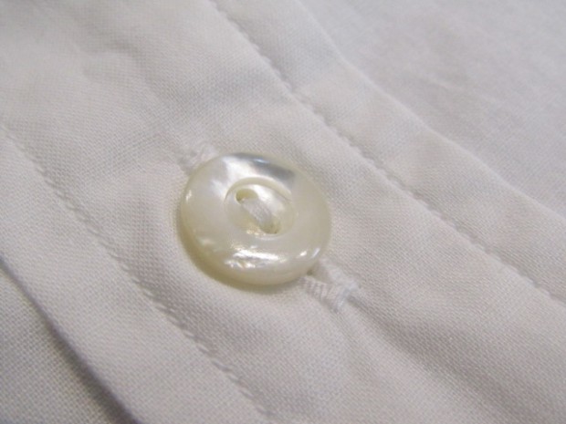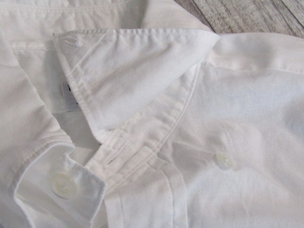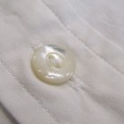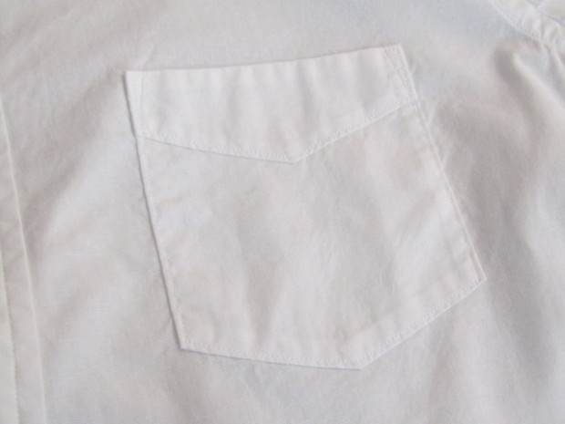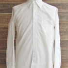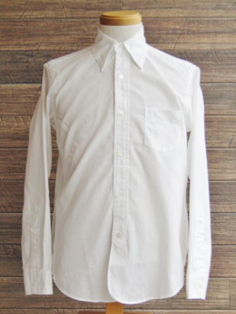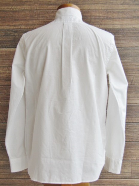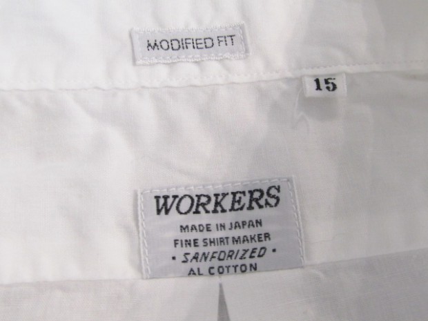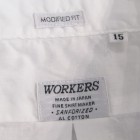 【ワーカーズ】 Lot 20, ヒドゥン BD ホワイトポプリン 初期WORKERS をご存じの方には懐かしい、隠しボタンダウン。襟先にボタンホールを開けた布を挟み込んでボタンダ ウンのホールを隠しています。もともと、古着でSUNSET、あのリーバイスが作っていたシャツを見つけ、そこに隠しボタンダウン仕様を見つけて作り始めました。古着はウール生地でしたが、今回はよりシャツとして着やすい素材で。裾もラウンドさせたクラシックなデザインに。 素材、無地は40番糸の平織り生地。3 オンス程度で薄く軽い。双糸(二本撚り合わせの糸)ではなく単糸なのでラフな 風合い。カフス、前立て、襟といった要所には薄い芯を入れ形崩れを抑えています。 3オンス系の生地は夏場に最適。中に薄い機能性インナー(グンゼのカットオフがおすすめ)を着て、その上にシャツを着ると真夏でも比較的涼しい。 隠しボタンダウン、ネクタイをすることはできますがニットタイのような細めのものでないとスペースが足らず収まりが悪い。もう少しボリュームのあるネクタイをしたいときは、隠しボタンを外しレギュラーカラーとして着られるがこのシャツの良いところです。通常のボタンダウンはボタンをはずすとちょっと着る時を選びますよね。 製品はOW済です。