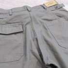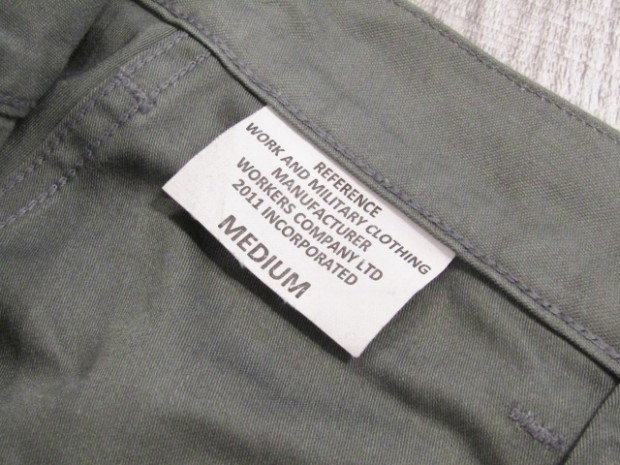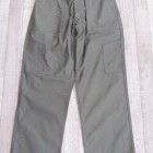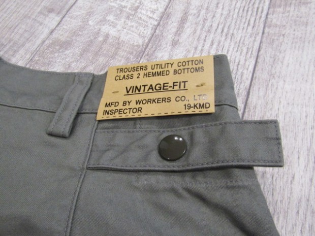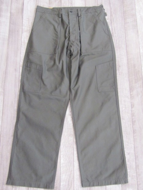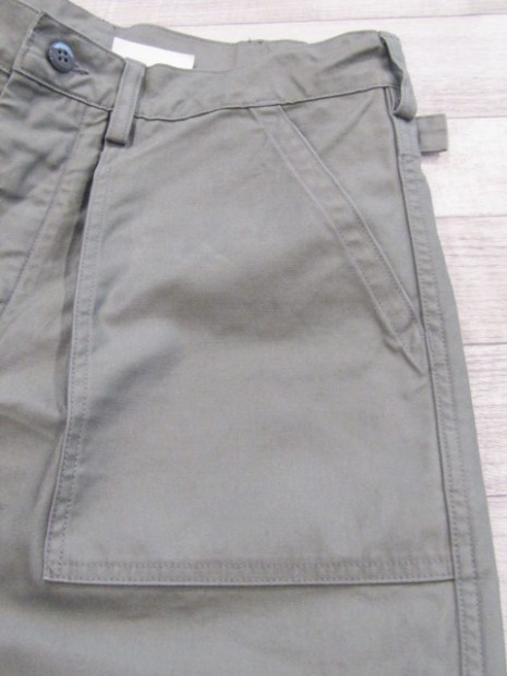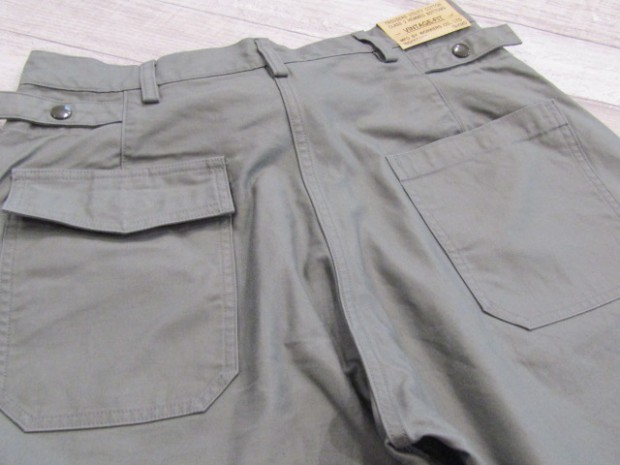【ワーカーズ】 エアフォースベーカー ビンテージフィット セージグリーン 俗に「エアフォースベーカー」と呼ばれる、空軍のラベルがついた古着を元に作りました。 デザインが凝っていて、フロントポケットの下にタック。さらに、フロント膝上には左右ポケット。背面、左身頃のポケットがフラップ+ヒヨク止め。後ろ身頃はダーツも入り、そこにウェスト調節用のタブがつき、スナップ打ち部分には補強布。さすがミリタリーウェアと言えるやりすぎ感です。作るのは、6ポケット(軍パン)に準ずるほど難しい!だからか、エアフォースラベルの付くいわゆるベーカーパンツ(本当はTrousers,Cotton Sateenだと思いますが)も後によりシンプルな、アーミーと同じデザインに変わって行ってしまいました。 VintageFitは参考にしたオリジナルほぼそのままのサイズ感。タック・ダーツがあるので、ヒップ周りはゆとりあり。 Sage Greenの素材はM-51系、目が細かいバックサテン。オリジナルのデッドストックを参考に「セージグリーン」色をつけてもらいました。製品はOW済です。