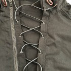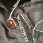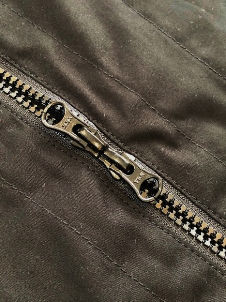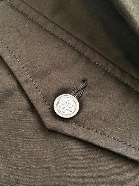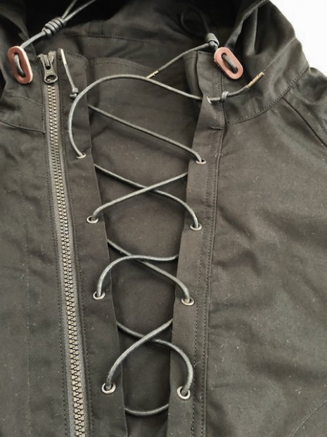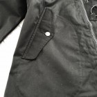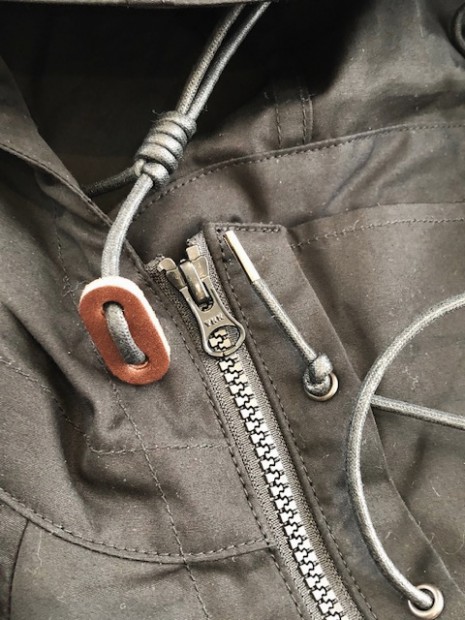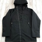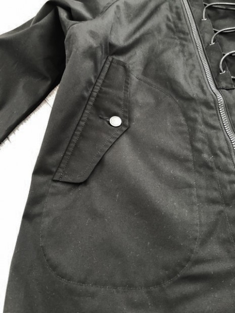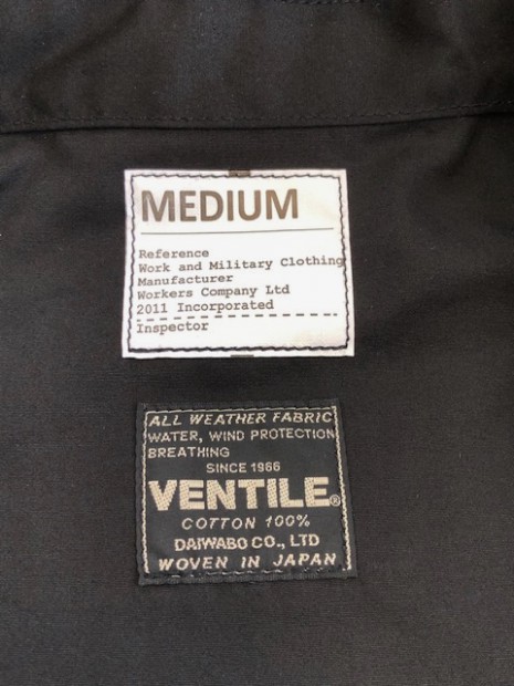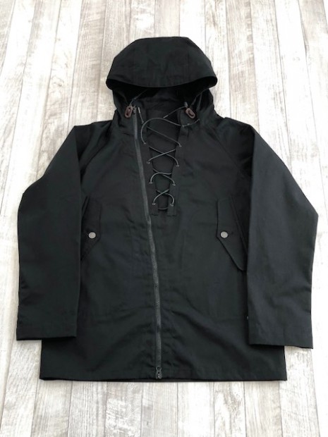 【ワーカーズ】 N-2 パーカーモィファイド ライトウェイトコットン ベンタイル ブラック 今期の新作。デザインソースはご存じ、USN・俗に「レインパーカー」と呼ばれるフロントが編み上げのパーカーと、13スターボタンのついたWet Weather Parka。(そういう意味ではN-2って名前は若干違うのですが) オリジナルはかぶりで前開きがありません。古着好きな方なら、安いしかっこいいし一度はオリジナルを着たことがあるのでは?私も15年ほど前、大雨の日にかっこつけて仕事で着ていましたが、ゴム引き生地の強烈な匂いに午前中でギブアップ。 さらに、ロッカーに入れていたらカビた苦い経験があります。 フロント編み上げのデザインは活かし、前にファスナー開きをつける。そして素材はコットンベンタイル。ここまでは、数年前にアイデアができていました。が・・・型紙が出来なかったのです。やってもやっても、どうやってフードをつけるか、左右非対称型なのでポケットが入らない、ファスナーの長さが合わない。オリジナルのフロントについている、切り替えマチをどうやって左右非対称型に落とし込むか、等など・・・ちょっと文章で表現するのは不可能なぐらい難しかったので、細かい話は展示会で。 物としての機能性はRAF PARKA と同じく、一重の軽い撥水パーカー。型紙はRAF PARKA よりさらにゆったり目。フロントのファスナーがYKK・滑りがとても良いビスロンのダブルファスナーなので上げ下げにストレス無し。ファスナー がフードまで上がっているので顎まわりまでカバー。ただ、顎をカバーするのにゆとりが必要なので本来はフロントのマチ状の三角形が必要なのです。これを切り替えではなく左身頃側に入れたのがポイント。平らに置くとわかりますが、左身頃の編み上げ部分がかなり横方向大きくできています。これを、紐で適度に絞ると左右対称の形になります。 製品は洗いなしで納品予定です。