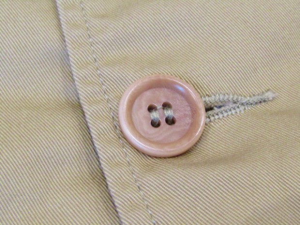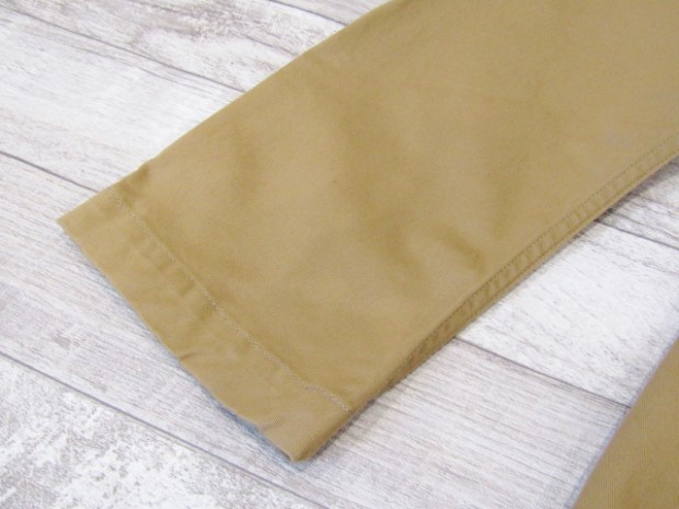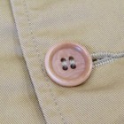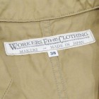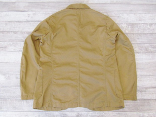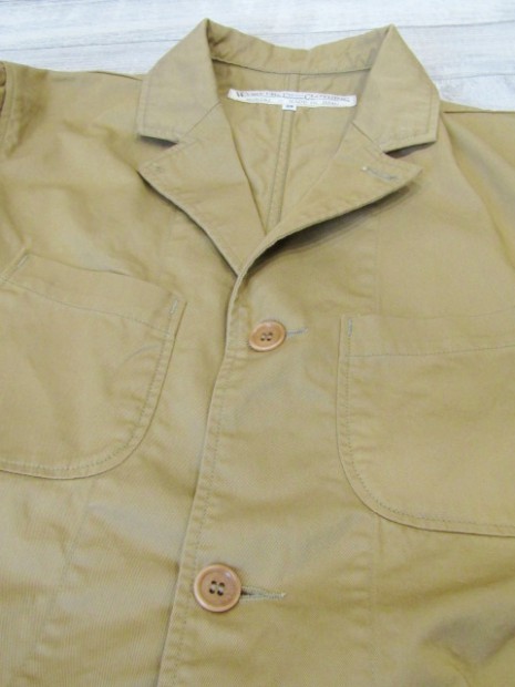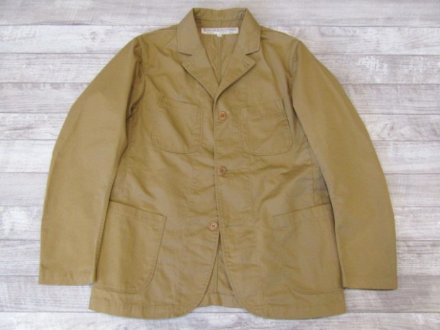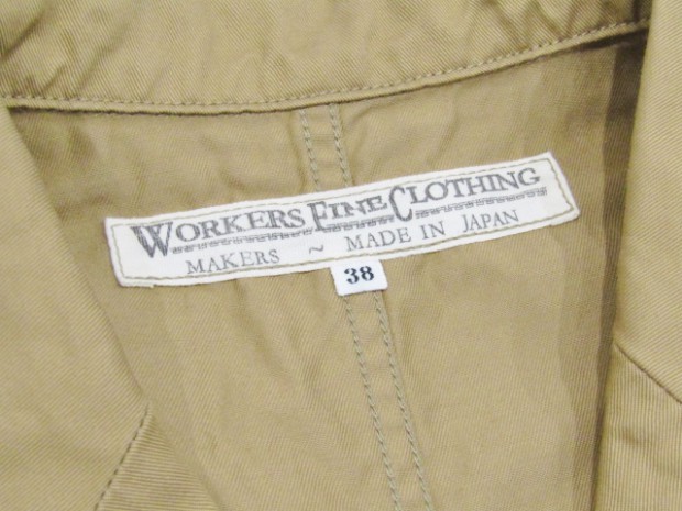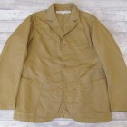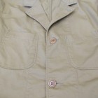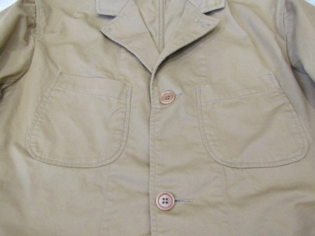 【ワーカーズ】 ラウンジジャケット ライトチノ ベージュ 以前から 「作らないのですか?」 「作りましょうよ!」とご要望が多かった、春夏バージョン・薄手素材で作るLoungeJacket。せっかく作るならと仕様も新しく。 ビンテージのSweet Orr、おそらく「ノーフォークジャケット」と呼ばれる四つポケットのデザインをもとしました。ポケットつけもオリジナルを参考に、部分的に地縫いを入れています。 フロント見返し、秋冬のLounge Jacketでは脇の縫い目まで伸びる大見返しを、いわゆるカバーオールのような身頃たたきつけに変更。より軽く、カバーオール的な着やすさ、気安さを狙って。袖裏が無い分、中に着たシャツが引っかからないよう袖は少し太め。シャツの上はもちろん、Tシャツの上にも着られるラフな素材、仕様。でも、型紙のベースはLounge Jacketで、前ぶりのある袖、丸みのある身頃。シャツの延長線上で作られた物とは違う、「ジャケットらしさ」をキープしたシルエットです。 素材、ネイビー・オリーブ・ベージュは7オンスクラスのチノ。定番の10オンスよりは薄い、でも5オンスになってしまうとチノというよりはシャツ生地・ツイルという風合いになってしまう。ギリギリ「チノ」と感じる厚みのライトオンスチノ。巻縫い、ポケットつけ、見返しつけ、ステッチ部分に立体的な皺が出るのがライトオンスチノの良さ。SandBeige、Oliveは4月納品のFWPTrousersと、セットアップにもなります。