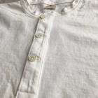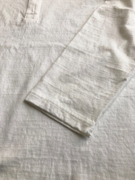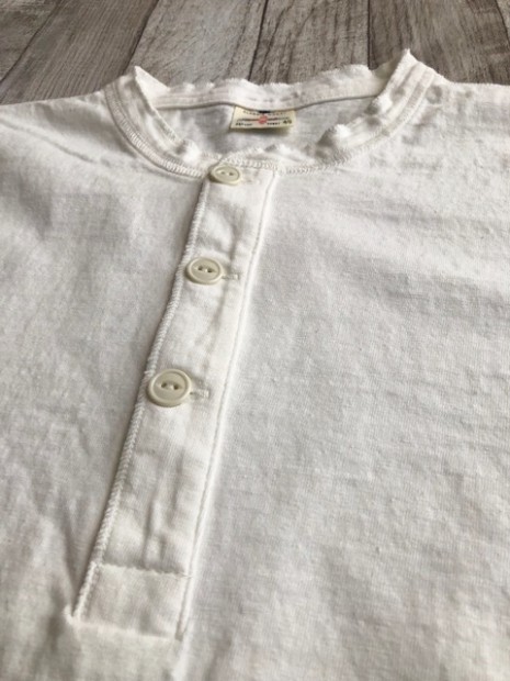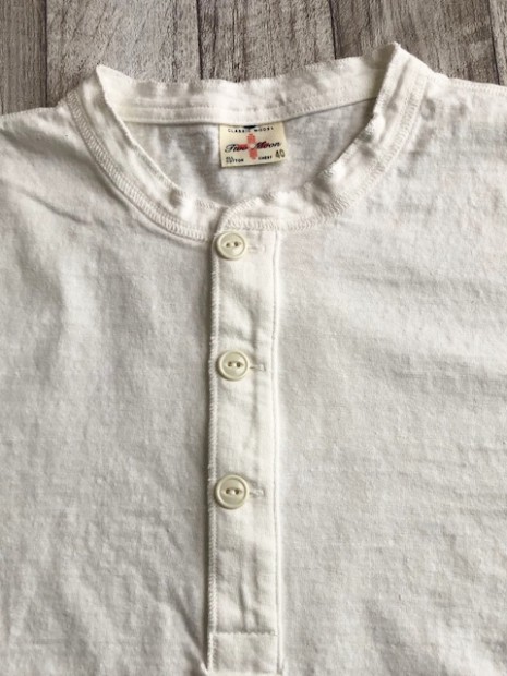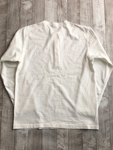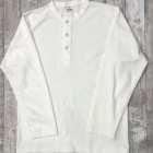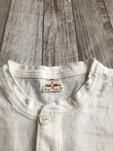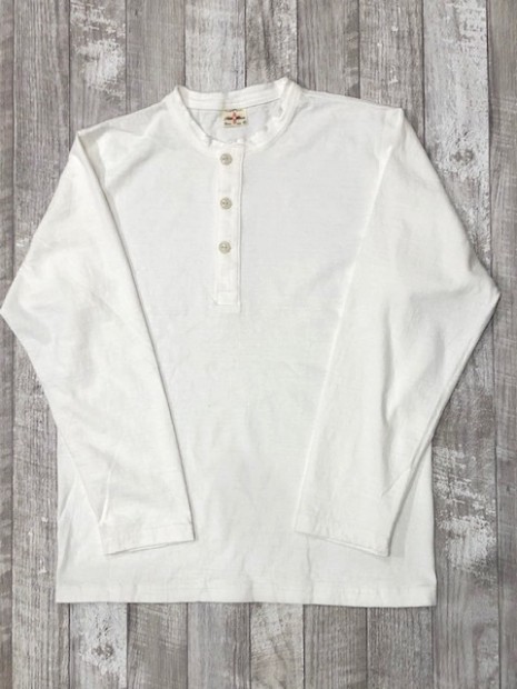 【トゥームーン】 ヘンリーネック ロングスリーブ Tシャツ ホワイト リニューアルしたヘンリーネックL/S TEEシャツです。素材を16/-ラフィ天竺に変更し、ドライタッチ、かつやや肉厚な生地感にしました。丸胴ボディを採用し各部の接合にはもちろん4本針縫製が用いられています。フロントのボタンはオーソドックスな3つボタン仕様。これ一枚でも重ね着用のインナーとしても活躍してくれます。夏の終わりから秋口にかけて活躍してくれるL/Sヘンリーネックは一枚あると重宝します。