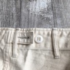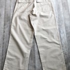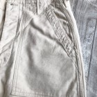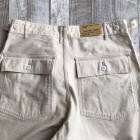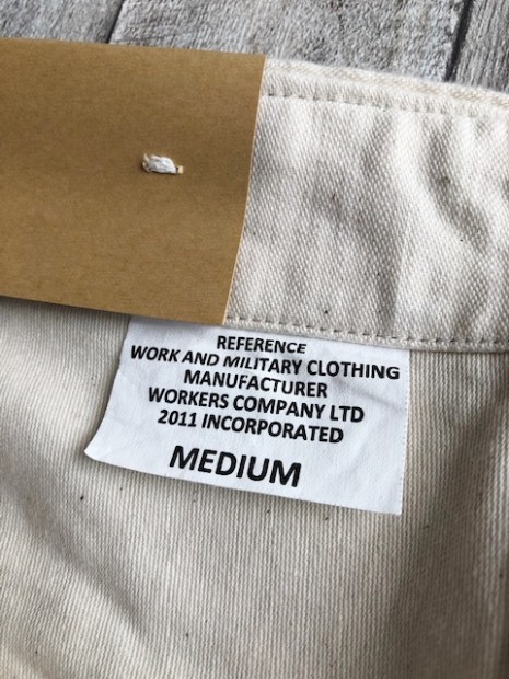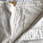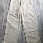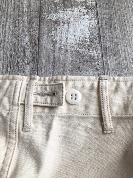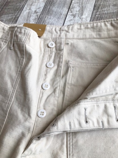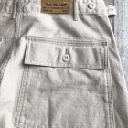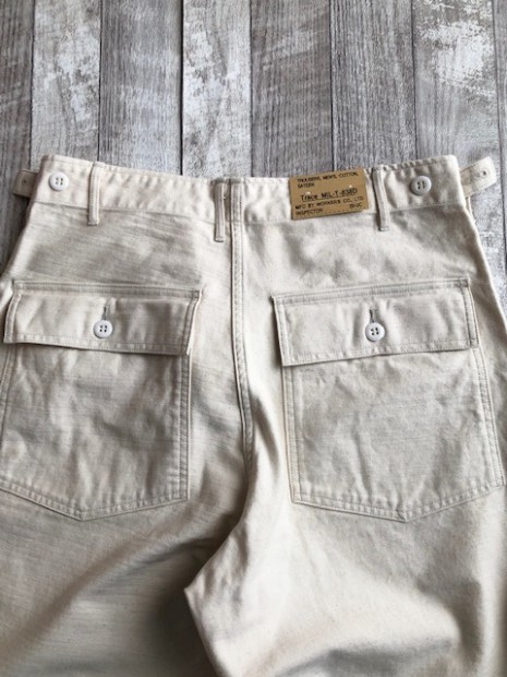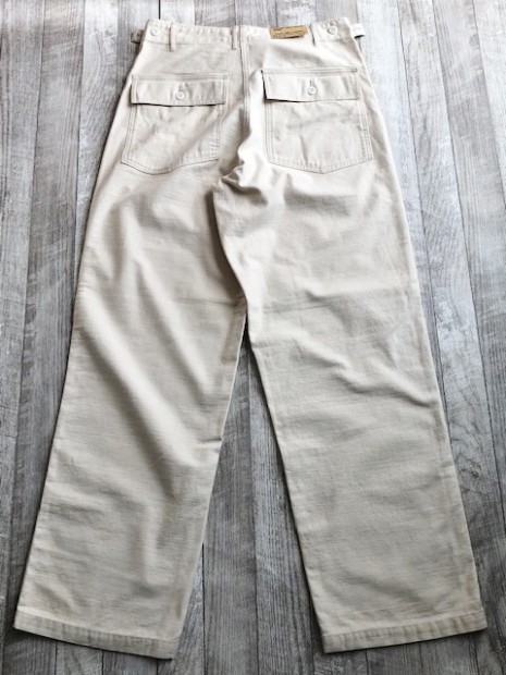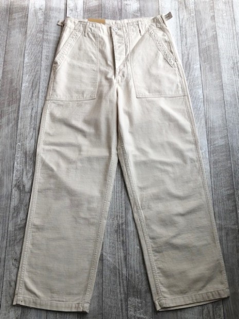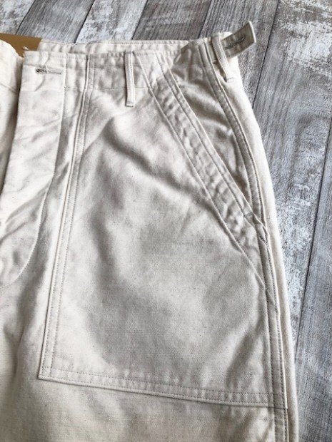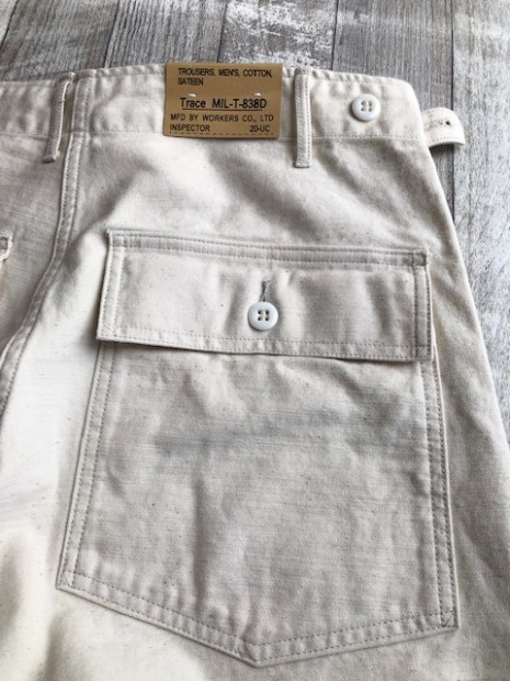 【ワーカーズ】 ベーカーパンツ Trace MIL-838-D エクリュ 久しぶりに通称「ベーカーパンツ」の型紙を作り直しました。 WORKERS のベーカーパンツ、もともと、MIL-T-838D の未洗い製品の各部寸法を取って元型を作りました。 が、長年修正を繰り返し、結果、オリジナルとはちょっと雰囲気が違ってきている。ここでもう一度基本に立ち返り、オリジナルのシルエットを取り直そう。それも以前は解体まではしないでシルエットを取りましたが、今回は完全に半分解 してシルエットを抜き出そう!という企画です。 分解のコンセプトはやはり、「半分解展」でおなじみの長谷川君からです。彼の展示を見て、久しぶりに「そうだよ、昔は自分だって解体しまくってたじゃないか!」と初期衝動を思い出しま した。彼がまだ学生時代に、WORKERS のお店(昔倉敷にありました)に来てくれて。その時、一緒に来たS君は今でも WORKERS のモデルを務めてくれています。あの当時、私のやってることに興味を持ってくれていた二人に今は教えても らったり、手伝ってもらったり。WORKERS、続けてきて良かった!と思う瞬間です。 シルエットは、MIL-T-838D をトレース。 解体した前・後ろ。ところどころに補助線が見えると思います。生地自体、裁断・縫製でゆがみもあるの で完全にこれと同じに取ってしまうのは難しいのですが、出来る限り精密に。でも、明らかに歪んでいる部分は微修正しながら型紙を取ります。各部の寸法 を測っては、CAD に入力。身頃、数パーツに分けて出力して、紙と現物を重ね合わせながら微調整・修正をして型紙にします。 解体してわかることはシルエットだけでなく、各部の縫い代の入り具合、切り込みの入れ方があります。これがとても大事で、縫い代の入り具合はパターンに落とし込みます。具体的には縫う人が「あらよっと」で縫いこんだり、浅くしたりして対応してしまった部分をあくまで「上がり線と均等な縫い代」に置き換えていく。要するに、昔のパターンでそのままではできなかった部分を現物合わせで修正しています。 素材、10 年ほど前、生地屋さんに右ページの実物とMIL-C-10296J をもとに作って もらったバックサテン。OD はスペックに「The use of dyes or substances containing elementary sulfur compounds...」 とあるので硫化染めで。 COYOTE は逆に色の落ちづらい反応染め。Ecru は糸の色そのままの生成り。 製品はOW済です。