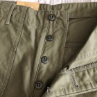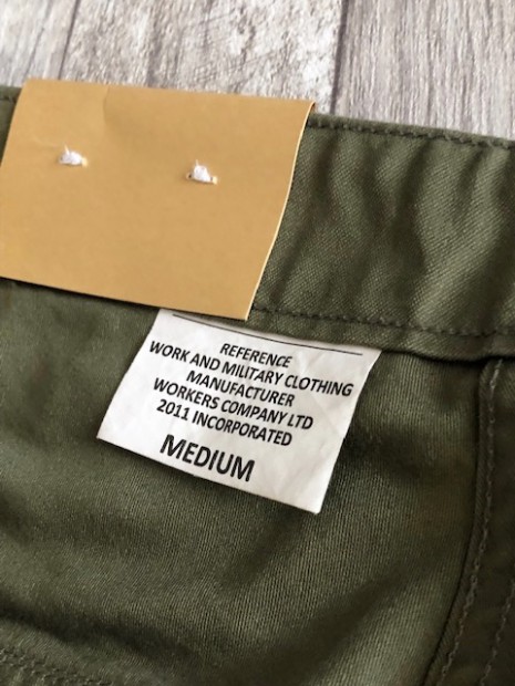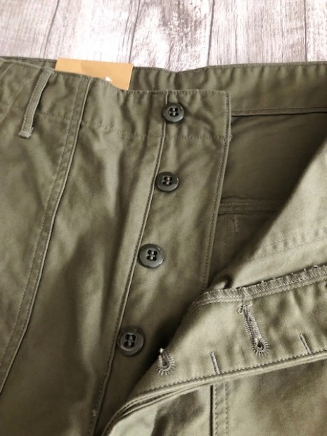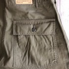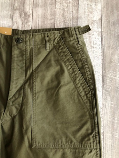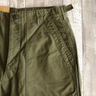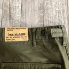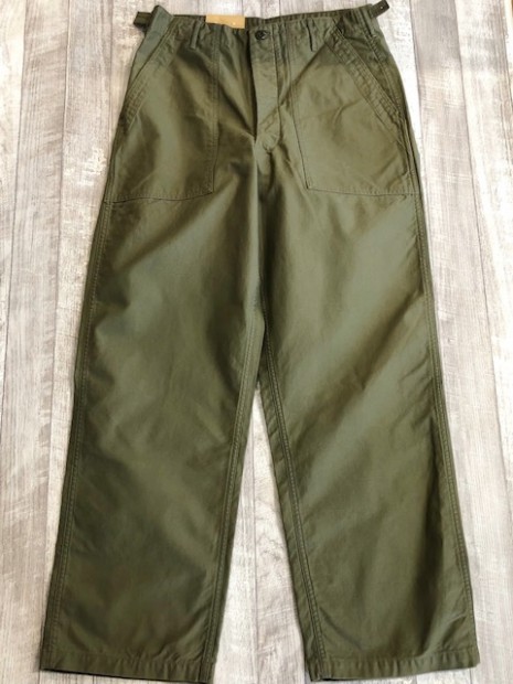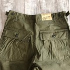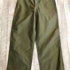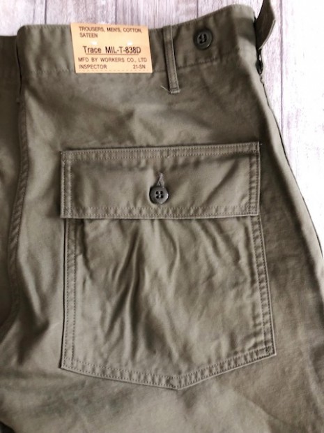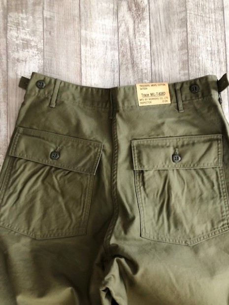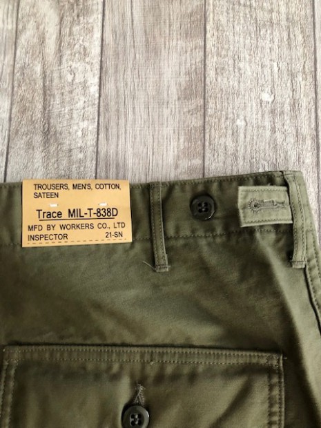 【ワーカーズ】 ベーガーパンツ トレース MIL-838-D バットダイ OD WORKERS のベーカーは、10 数年前、MIL-T-838D の未洗い製品の各部寸法を取って元型を作りました。が、長年修正を繰り返し、結果、オリジナルとはちょっと雰囲気が違ってきている。ここでもう一度基本に立ち返り、オリジナルのシルエットを取り直しました。 以前は解体まではしないでシルエットを取りましたが、今回は完全に半分解してシルエッ トを抜き出そう!という企画です。分解のコンセプトはやはり、「半分解展」でおなじみの長谷川君から。彼の展示を見 て、久しぶりに「そうだよ、昔は自分だって解体しまくってたじゃないか!」と初期衝動にかられ。彼がまだ学生時代に、 WORKERS のお店(昔倉敷にありました)に来てくれて。その時、一緒に来たS君は今でもWORKERS のモデルを務めてくれています。あの当時、私のやってることに興味を持ってくれていた二人に今は教えてもらったり、手伝ってもらっ たり。WORKERS、続けてきて良かった!と思う瞬間です。 シルエットはMIL-T-838D をトレースしたもの。太い裾、広いワタリ、深めのまた上。いわゆる「軍パン」のシルエット。 素材、Surfer DyeのODとBlackは、MIL-T-838D の個体とMIL-C-10296J という生地のスペックを見て作った いわゆる「ベーカーに使われる目の粗いバックサテン。」 一方、Vat DyeのODは、同じ「バックサテン」と呼ばれる生地でももっと糸が細く目が細かい。M-51カーゴパンツで見られる物をリプロした生地。Vat Dyeは一般的に、Surfar Dyeより色が落ち伝いと言われます。確かに、平らな部分の色落ちは緩やかですが、凹凸が出た部分は糸の表面が削れて毛羽が立つ。結果、パッカリングはSurfer Dye以上に激しく見えてきます。 製品はOW済です。