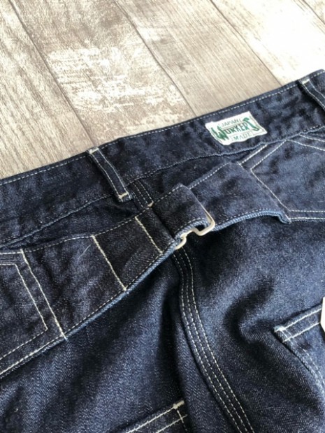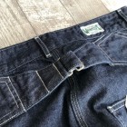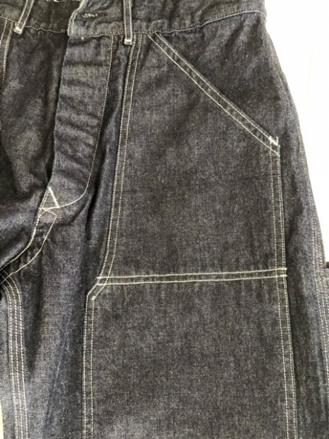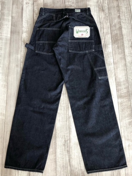 【ワーカーズ】 ヘラクレス パンツ お客様から「最近WORKERS を知ったのでぜひあのワークパンツをもう一度!」とご要望をいただき久しぶりに作って みました。 Hercules のオリジナル、持っていたのは38 インチ程度で大きかったので、一度それをトレースしてから、 32 サイズ(ウェスト82-3 センチ)にグレードして型紙を作りました。オリジナルは邪魔だったのかバックルは切り取られていました。そこでバックルの先部分は、古いシアーズのカタログ・SR Best というブランドで似たデザインのイラス トを見つけ、そこから想像してデザインしました。バックルは針シンチタイプ。椅子や車のシートには傷がつきますので ご注意ください。バックル無しのPlain もラインナップ。もっと楽に、雰囲気を楽しみたい方はPlain を。 フロントは「ダブルニー」と呼ばれる、身頃に補強布をたたきつけているデザイン。上部がポケットの機能もはたしてい ます。特殊なのが身頃の前後配分。通常であれば前・後ろを50% 50%、もしくは少し前を小さく作るところ、今回は逆。 前が大きく後ろが小さく作られています。ダブルニーにポケットとしての機能性も確保するため、ある程度幅が必要で、 後ろより前が幅広に作られているわけです。 素材はベーシックな10 オンス・耳付きデニム。脇・内股ともに巻縫いしてしまい、縫い代は見えなくなるのでほとんど 耳を使う所は無いのですが、以前も使ったこのベーシックなデニムが好きなので今回も使いました。