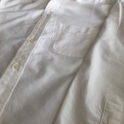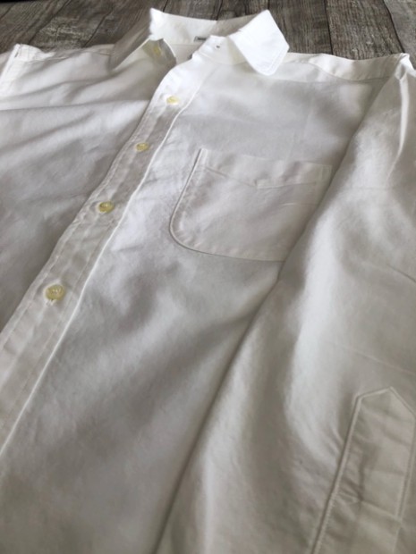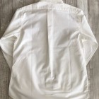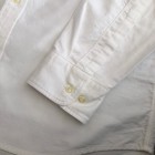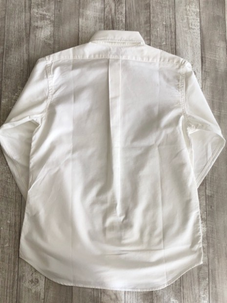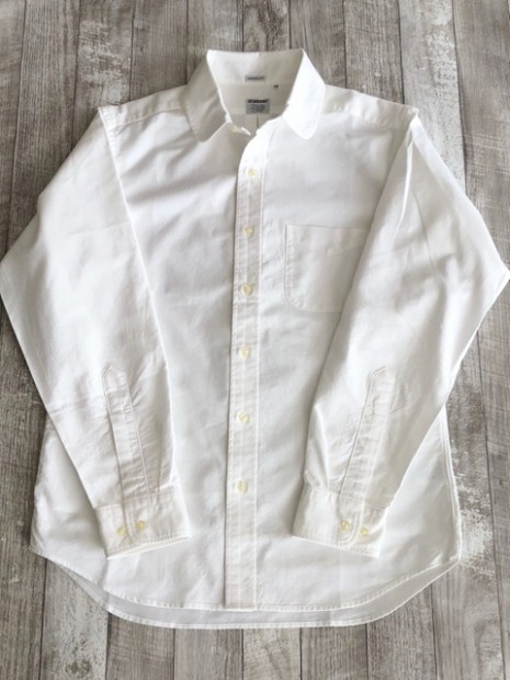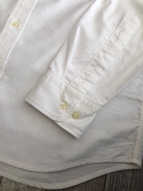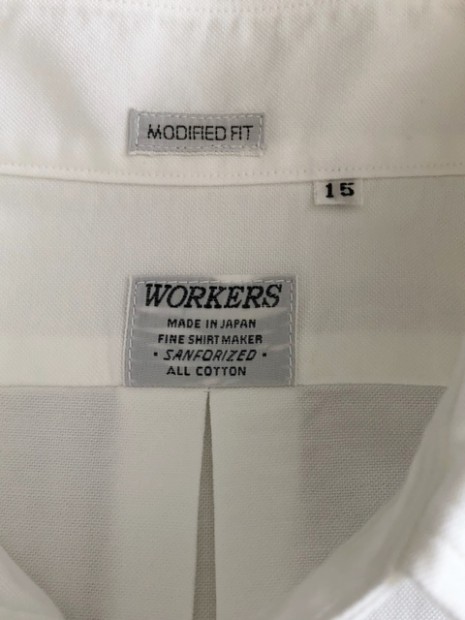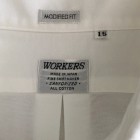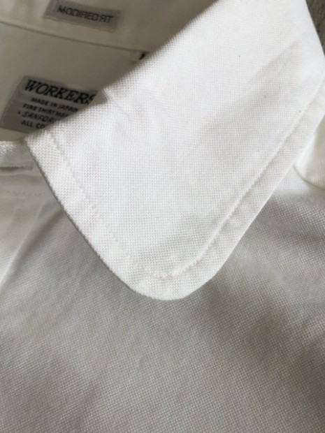 【ワーカーズ】 モディファイド ラウンドカラーシャツ スーピマOX 2020 年更新で、以前より首回りが2 センチ大きくなりネクタイを締めやすくなったModified Fit。 22SS は、身頃をそのままでラウンドカラーを展開。身頃、フィット感はあるがピタピタでは無い。肩幅も落ちすぎず、入りすぎず。着丈は裾を出しても・入れても着られる 75センチ前後がマスターサイズ。袖ぐりのカマ(縦方向の寸法)自体はある程度余裕があり、 窮屈さは無い。でも肘から先をわずかに細くしてすっきりと。その分、袖がまくりづらくなるので、袖口の開きは深めにとる・・・といったように、機能性を考えて型紙をひいています。 デザイン的なシャツでは無く、設計的なシャツとでも いうのでしょうか。型紙を自分でひくからこそ、こういう作り方の品番もあるのです。 製品はOW済です。