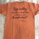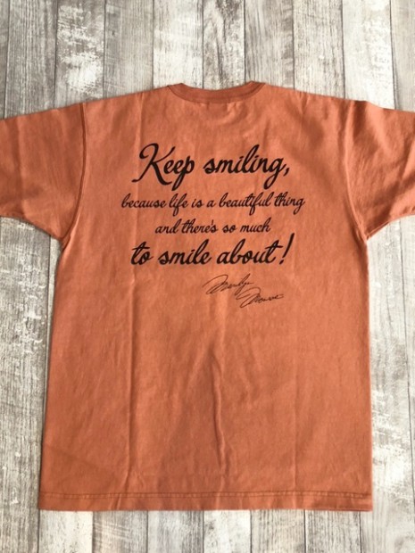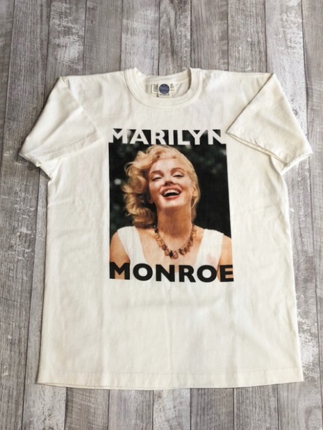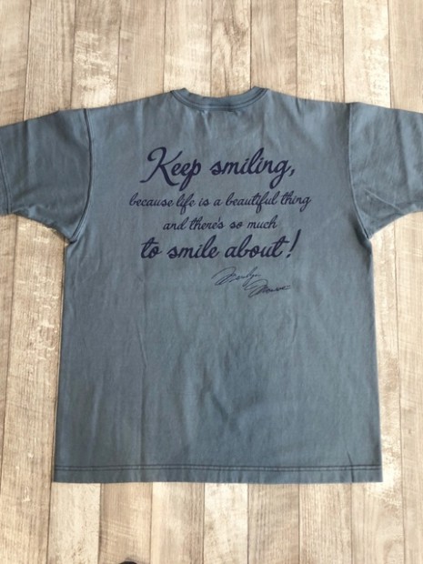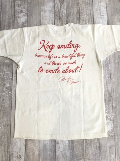 【トイズマッコイ】 マリリン・モンロー TEE ”キープスマイリング” 永遠のセックスシンボル。そう評されることの多いマリリン・モンローの全く違ったナチュラルな笑顔を収めた一葉。撮影は親友でもある写真家、サム・ショーで1957年に劇作家のアーサー・ミラーと結婚した当初のプライヴェートな写真の中からピックアップしました。背中の文節はモンロー語録の中から【笑顔を忘れないで。人生は美しいものなので微笑みたくなることがたくさんあるから。】を選びました。