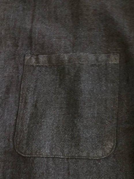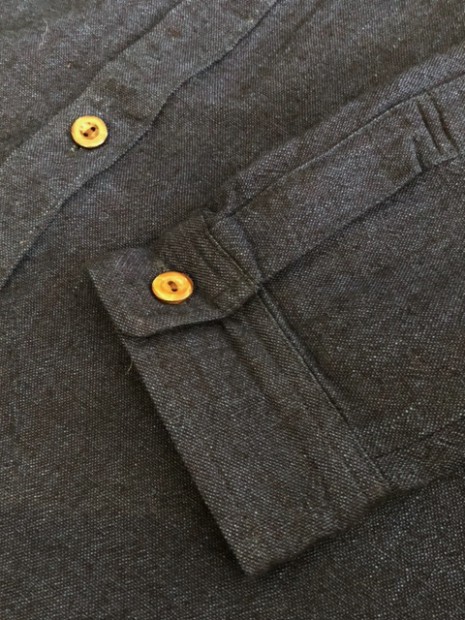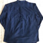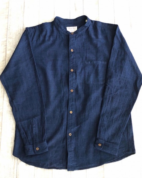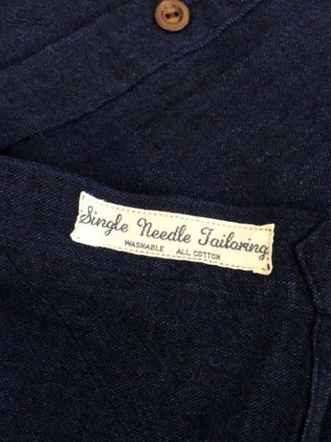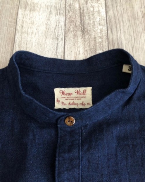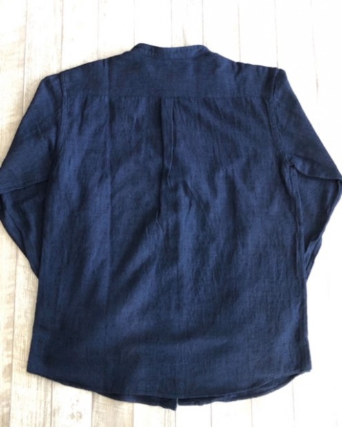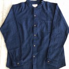 【UES】 インディゴバンドカラーシャツ 532202 インディゴの古布を参考に企画したオリジナルの生地がこの製品を特徴づけています。古布(おそらく手織りと思われる)を分析し、可能な限り風合いを再現して作りました。紡績技術が未熟な昔の糸は独特の形状をしており、それを再現するためにスラブ糸とムラ糸を組み合わせています。シャツの形はバンドカラータイプにしました。形は#532201のバンドカラーOXシャツと共通ですが、生地が薄いためポケット口は裏から補強しています。 ※この製品は洗い加工が施されています。商品によっては多少のサイズ誤差が生じる場合があります。