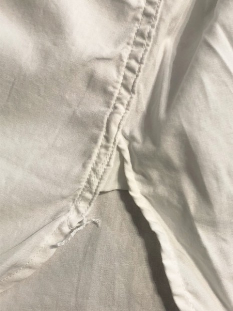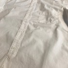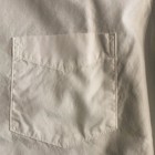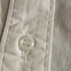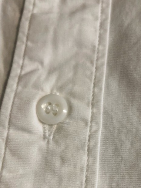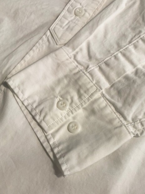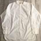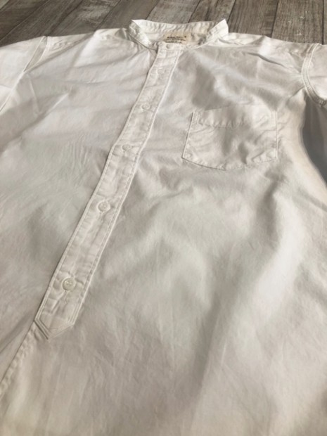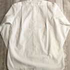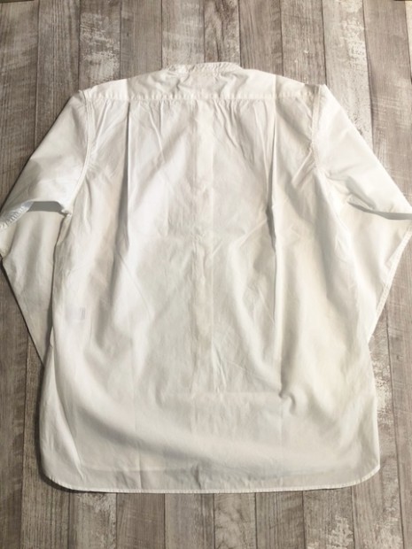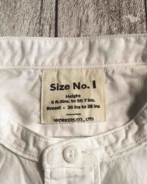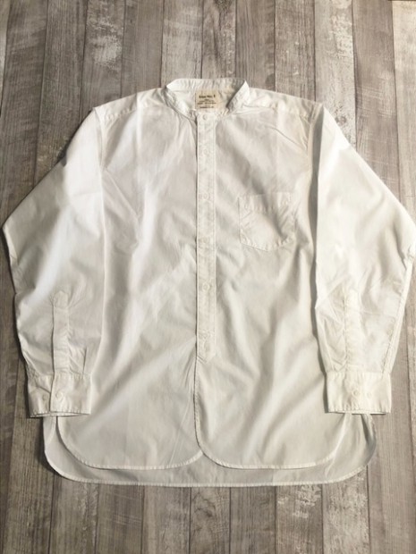 【ワーカーズ】 バンドカラーシャツ, ホワイトブロードクロス ビンテージのイギリスミリタリーらしきバンドカラーシャツから着想を得て作りました。 オリジナルはバンドカラーにスタッドボタン + 袖口折り返しタイプでカフスボタン止め。ちょっとドレスウェアすぎる仕様。このままでは着づらいので、台襟・袖口を通常のボタン仕様に変更。 着丈はオリジナルが 80 センチを超える寸法 から76センチ程に変更。裾を出しても、入れても着られる、WORKERS が考える「Modified」な着丈。身幅も今に合わせてゆとりを出す。ただ、肩幅は45センチほどでいつもの「Modified Fit」。肩を落としすぎると、あまりにも「今」っぽい。オッサンがそれをやると子供っぽくなるので私は普通の肩幅が好きです。肘巾もゆとりを出す。シャツを着た時突っ張らない為には、身頃だけでなくこの「袖幅のゆとり」も重要です。 素材は3 オンス程のブロードクロス。薄手、ドレスシャツでおなじみ。ベーシックなホワイト。 ボタンはあえての樹脂ボタン。オリジナルも貝ではなく樹脂だったので。 製品はOW済です。