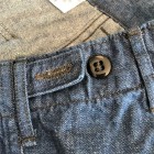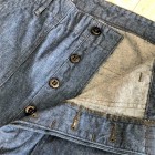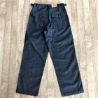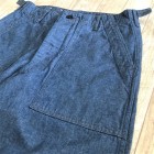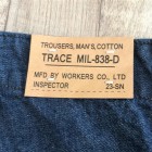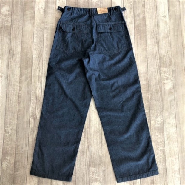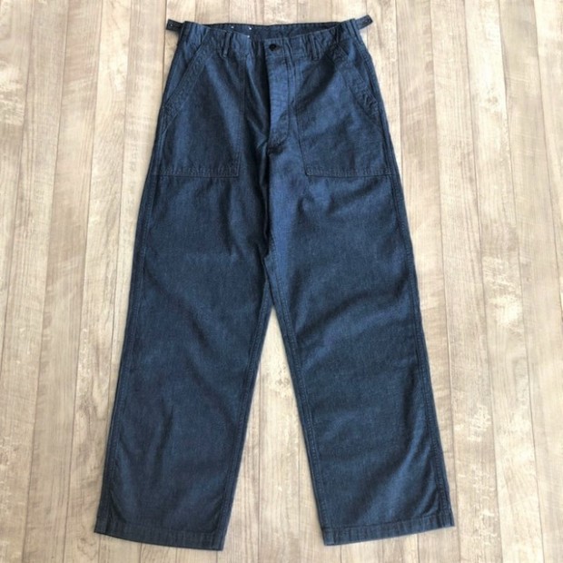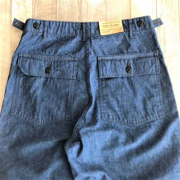 【ワーカーズ】ベーカーパンツ トレース MIL-838-D 10 オンス インディゴ デニム WORKERS のベーカーは、10 数年前、MIL-T-838D の未洗い製品の各部寸法を取って元型を作りました。が、長年修正を繰り返し、結果、オリジナルとはちょっと雰囲気が違ってきている。ここでもう一度基本に立ち返り、オリジナルのシルエットを取り直しました。 具体的には、解体したデッドストック、MIL-T-838Dからトレース。太い裾、広いワタリ、深めのまた上。いわゆる「軍パン」のシルエット。 ビンテージミリタリーでよく見るやたら細いループの為に専用ミシンのループ縫いミシンを用意して工場に支給。腰裏の環縫いも当初はミシン作って支給していましたが、その後は工場さんがミシン買ってくれて・・・でもその工場は作ってくれなくなり・・・紆余曲折はありますが、今縫ってくれてる工場さんは腰裏に慣れたのでうまいです。すごく独特な縫い方はしていますが。 10 オンスインディゴデニム。インディゴ染めでも少し薄め、明るめの色で春らしい雰囲気に。こんな変わった色でも硫化は入っていなく、インディゴの濃淡だけで出している色です。 製品はOW済です。