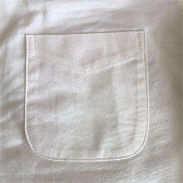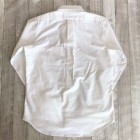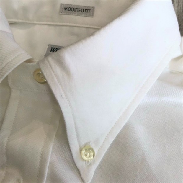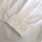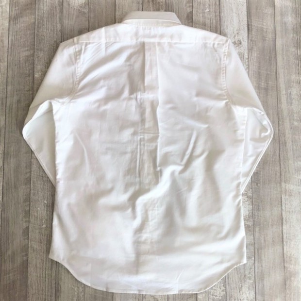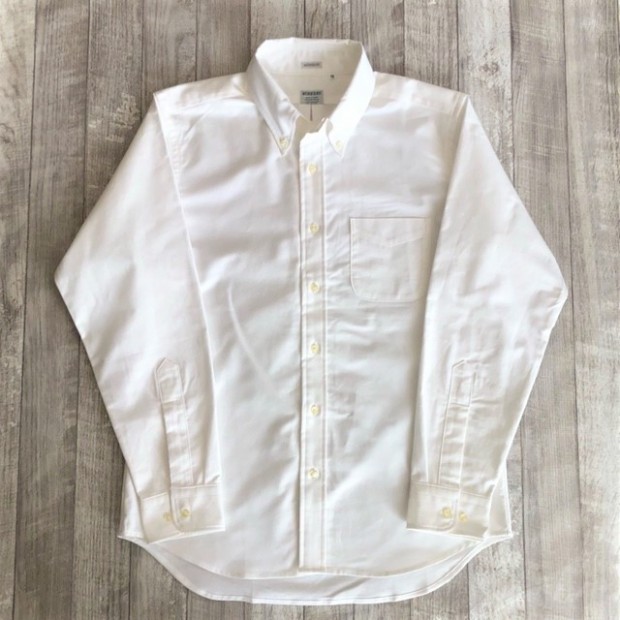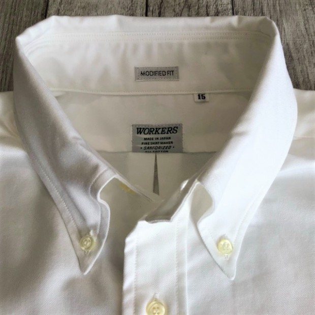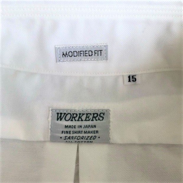 【ワーカーズ】 モディファイド ボタンダウン ホワイト スーピマ オックス WORKERS 定番、Modified Fit のボタンダウン。 身頃、フィット感はあるがピタピタでは無い。肩幅も落ちすぎず、入りすぎず。着丈は裾を出しても・入れても着られる75センチ程がマスターサイズ。袖ぐりのカマ(縦方向の寸法)自体はある程度余裕があり、窮屈さは無い。でも肘から先をわずかに細くしてすっきりと。その分、袖がまくりづらくなるので、袖口の開きは深めにとる・・・といったように、機能性を考えて型紙をひいています。「デザイン的なシャツ」では無く、「設計的なシャツ」とでもいうのでしょうか。型紙を自分でひくからこそ、こういう作り方の品番もあるのです。 今回から製品は洗い無し、ノンウォッシュでの納品です。洗い後、乾燥機にかけなければ寸法変化はわずか。乾燥機にかけると、各部1-2センチは縮みます。