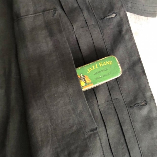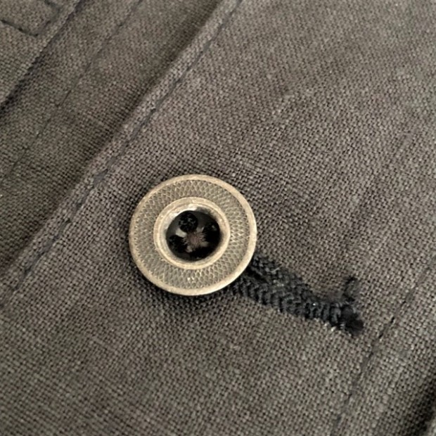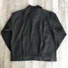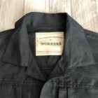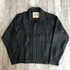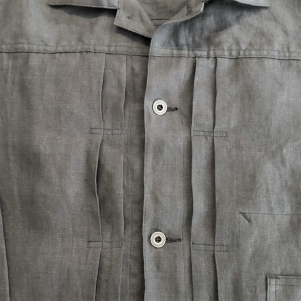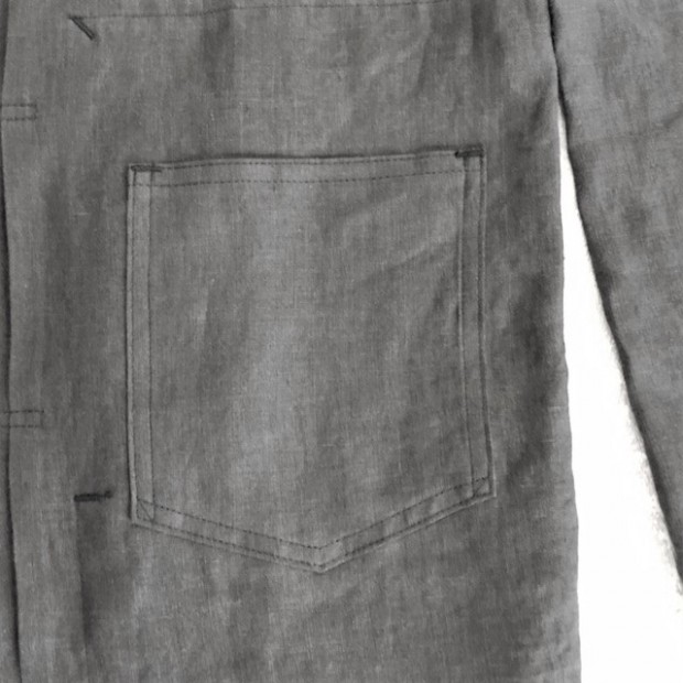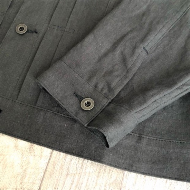 【ワーカーズ】 213 リネン ジャケット, チャコール リネン この数年、リネンでテーラードジャケット、カバーオールと作ってきました。 真夏、冷房の効いた室内や電車で出かける時に手に持って行くと安心。寒い時にぱっと羽織れる。適度な厚みのあるリネンはプルプルと張りがあり、肌から離れるので暑苦しくない。 着ていて思ったのが「これで腰丈、ブルゾン丈があれば真夏に最適だ」そこで思い出したのがいわゆるファーストタイプのGジャン型。 生地自体、デニムよりぐっと薄い5オンスクラスのリネンなので内ポケットを付けても暑苦しくならない。 最初は、シンチバックもつけてみましたが薄い生地にはどうにも危なっかしい。そこでシンチは取り去って、使い勝手を優先しました。 リベットも薄い素材は生地をかみ切ってしまったり問題があるのでカンドメに変更。 ボタンはあえて金属ボタンの糸付け。少し小さめを選ぶと・・・おお、いかにも古臭い、この形に良く合ったサイズでばっちり。 パターン、デニムのものをベースに縮率がほぼ無いリネン素材に合わせて修正。 リネン、夏の定番素材。5オンス程でほぼチクチク無し。このなめらかな手触りは織った後の洗いや染めにあります。滋賀にある生地の加工屋さん、徹底的に何回も揉んで、洗って。自然な柔らかな風合いになるよう乾燥もベルトコンベアに生地を乗せてものすごく大きな乾燥機で「ふわっと」乾かす。揉んだり・洗ったり・乾かしたりも一度で求める風合いにならなければ、何回も工程を繰り返したり。その工程も「なんとなく」ではなく、きちっとデータ・仕様になってそれぞれの生地・色ごとに管理。だから、この風合いが安定して生み出せているわけです。 製品は未洗いです。かなり強い防縮加工がかかっているのでアイロンをかければ寸法変化というほど変化はしません。