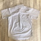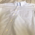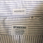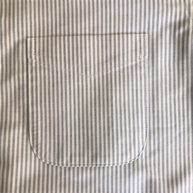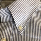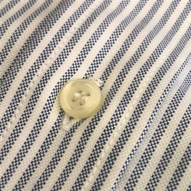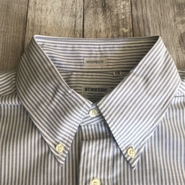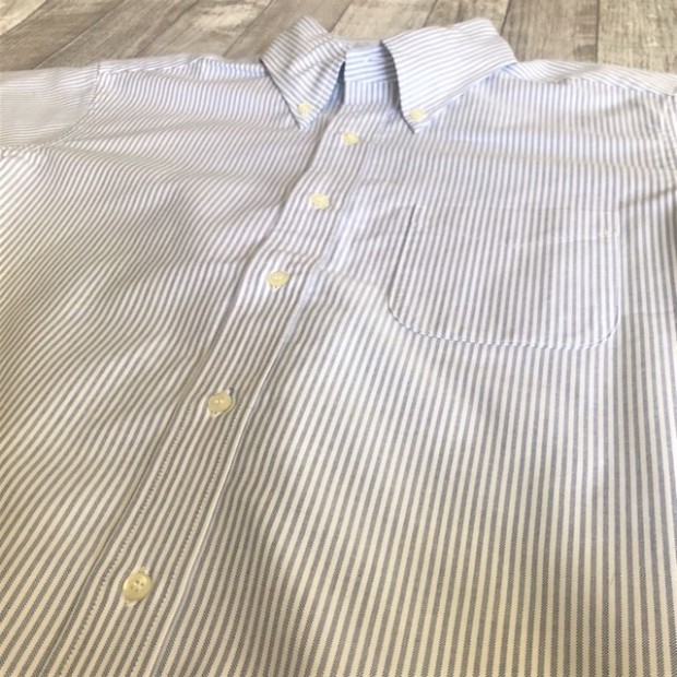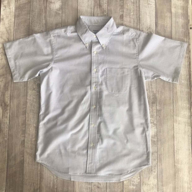 【ワーカーズ】 ショートスリーブ ボタンダウン ブルーストライプ スーピマ オックス 半袖のボタンダウン。 映画アポロ13 やアポロ11 のドキュメンタリーをぜひ見てください。NASA の職員が着ている半そでボタンダウンにギリッとネクタイを締めた壮観な眺め! 洋書:HOLLYWOOOD AND THE IVY LOOK のp 156-157、ここにも裾を出してラフにマドラス半そでボタンダウンを着 たアメリカングラフィティからの一葉。先のアポロ13 を監督したロン・ハワードの若かりし日。半そでBD にコットンパンツ、ローファーを合わせた組み合わせは私にとって強烈な「アメリカントラッド」「アイビースタイル」の印象を残 しています。 半袖だから当然ラフ、砕けた雰囲気だけど、襟がついて少しドレス風味。そこに、スポーツシャツ的なオックス素材。 今年はWORKERS 定番の5 オンスでブルーストライプ。 一見「なんでもない、半そでのボタンダウン」ですが、ぜひ裏返してご覧ください。袖ぐりはチェーンステッチを使った 折伏せ縫い。脇は極細の折伏せ。裾の三巻の美しさ。フロントももちろん、チェーンステッチ、専用ミシン・金具を使っ て。それがすべて、極細の綿糸で細かいピッチで縫われています。「どこにでもある服」のように見えてやっぱり違います。BDはノンウォッシュ納品。洗うと若干、1-2センチ程度縮みます。
