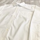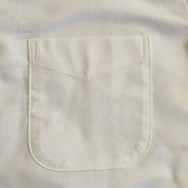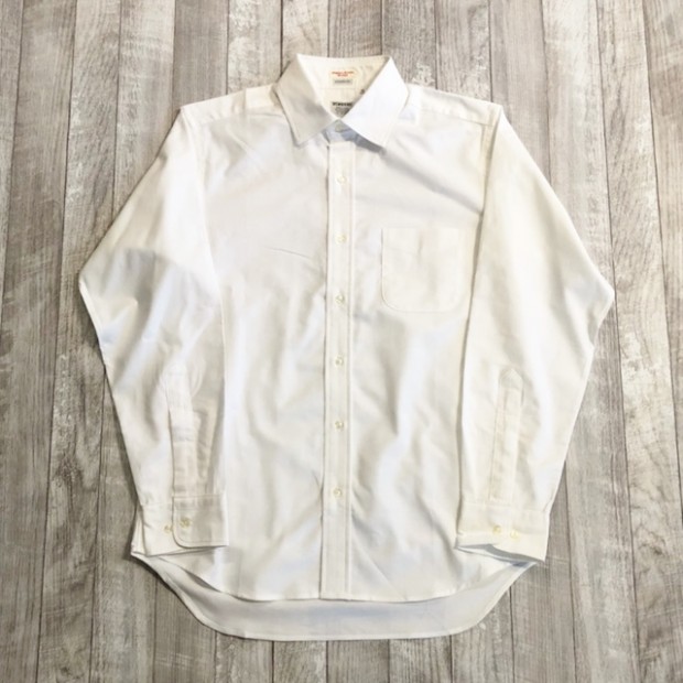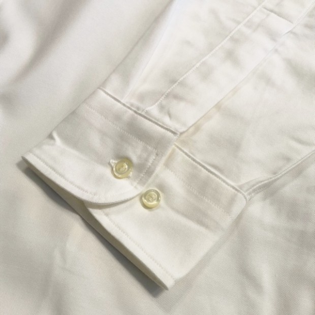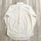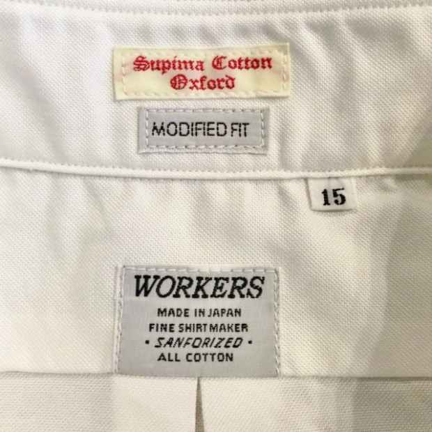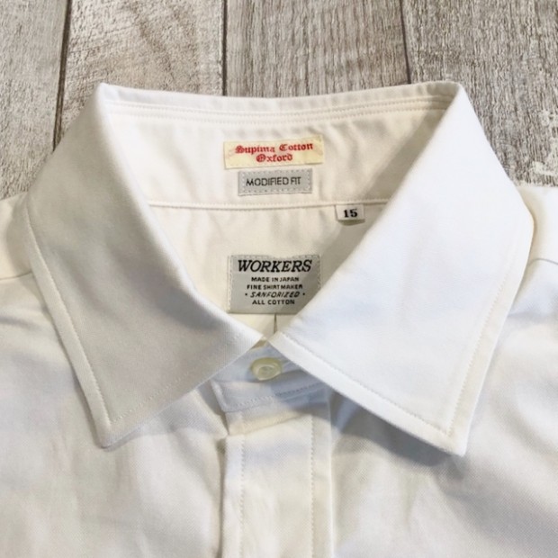【ワーカーズ】モディファイド ワイドスプレッド シャツ ホワイト スーピマ OX 定番のModified Fitシャツ。今季はWide Spreadをラインナップ。WORKERSのワイドスプレッド、以前はビンテージから全く違う襟型を起こしました。あれはあれで良いのですがちょっとクラシック感が強い。そこで、Modified BDの襟先を切り落としワイドスプレッドにしてみたらどうだろう?・・・と試してみると、やはりばっちりです。ネクタイは綺麗におさまる、でも台襟が高くなり過ぎないよう調整されています。 23FWは糸の太さ、密度は定番のスーピマオックス、少しガサッと固い。でも、これも着込んでいくと柔らかくなじんでいく。オックスのシャツを襟が擦り切れるまで着た事がある方はわかると思います。あの「ぼろいんだけど着心地が良くて手放せない」までいくのがオックスの良いところ。 ハンガーループ無し、肩ヨークもステッチ無し。シルエット、中にフィット感はあるがピタピタでは無い。肩幅も落ちすぎず、入りすぎず。着丈は裾を出しても・入れても着られる75センチ程がマスターサイズ。袖ぐりのカマ(縦方向の寸法)自体はある程度余裕があり、窮屈さは無い。といったように、機能性を考えて型紙を引いています。デザイン的なシャツでは無く、設計的なシャツ。型紙を自分でひくからこそ、こういう作りの方の品番もあるのです。