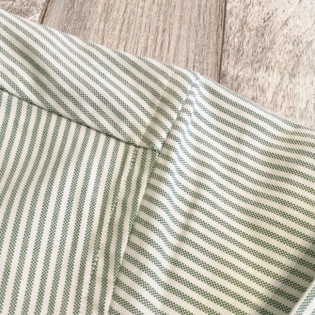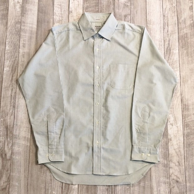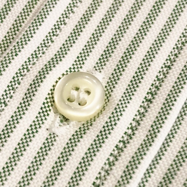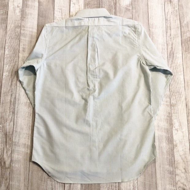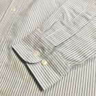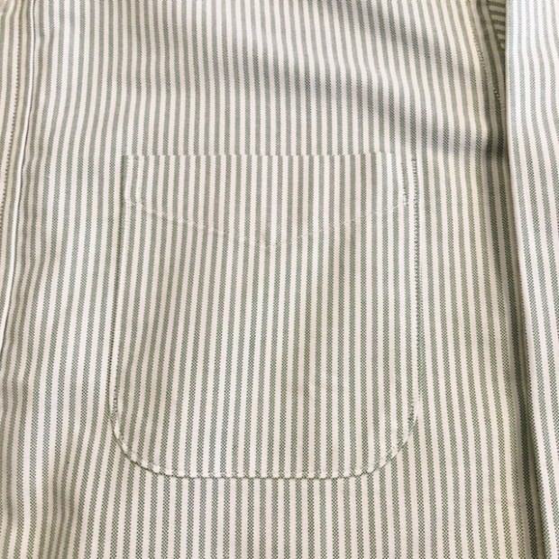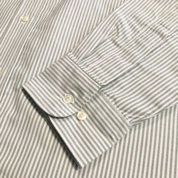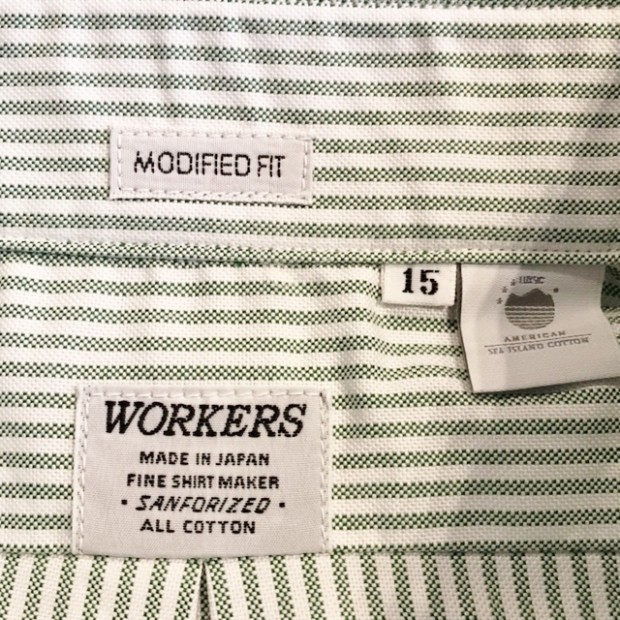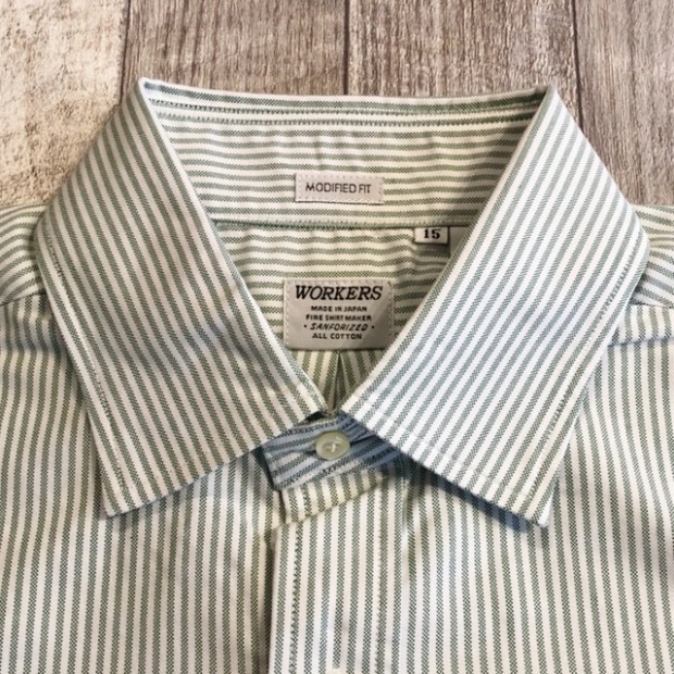 【ワーカーズ】 モディファイド ワイド スプレッド シャツ アメリカン シーアイランド コットン OX グリーン ストライプ 定番のModified Fitシャツ。今季はWide Spreadをラインナップ。WORKERSのワイドスプレッド、以前はビンテージから全く違う襟型を起こしました。あれはあれで良いのですがちょっとクラシック感が強い。そこで、Modified BDの襟先を切り落としワイドスプレッドにしてみたらどうだろう?・・・と試してみると、やはりばっちりです。ネクタイは綺麗におさまる、でも台襟が高くなり過ぎないよう調整されています。 23FWは、海島綿で新たなグリーン。糸の太さ、密度は定番のスーピマオックスと同じだが手触りが違う。海島綿はよりつるっと、ヌメっと。生地を2枚すり合わせてみるとよくわかります。このぬめりが着心地の柔らかさに影響します。 ハンガーループ無し、肩ヨークもステッチ無し。シルエット、中にフィット感はあるがピタピタでは無い。肩幅も落ちすぎず、入りすぎず。着丈は裾を出しても・入れても着られる75センチ程がマスターサイズ。袖ぐりのカマ(縦方向の寸法)自体はある程度余裕があり、窮屈さは無い。といったように、機能性を考えて型紙を引いています。デザイン的なシャツでは無く、設計的なシャツ。型紙を自分でひくからこそ、こういう作りの方の品番もあるのです。