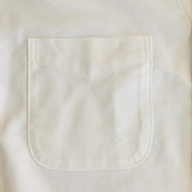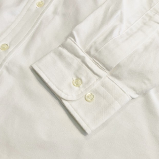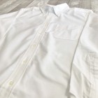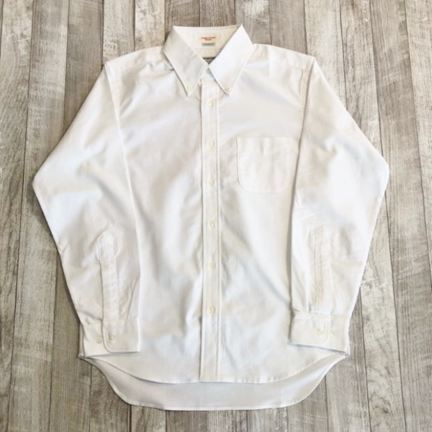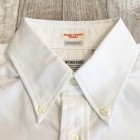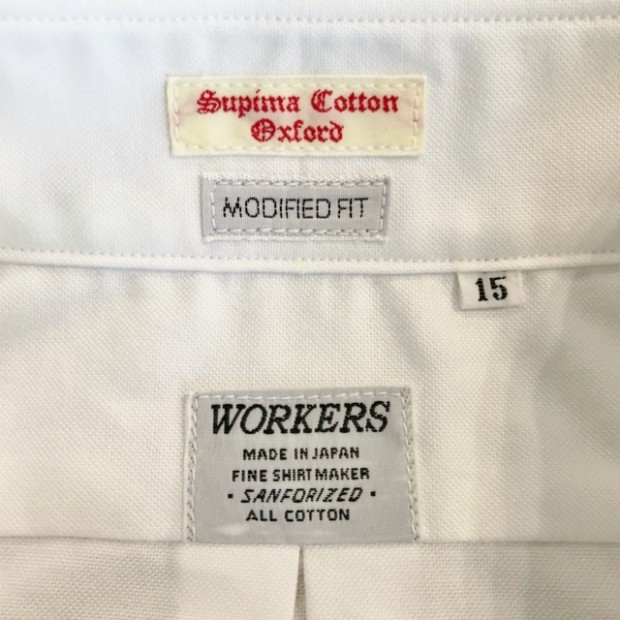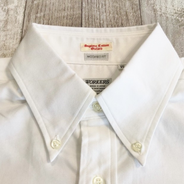 【ワーカーズ】 モディファイド ボタンダウン ホワイト スーピマ OX WORKERS 定番、Modified Fit のボタンダウン。 身頃、フィット感はあるがピタピタでは無い。肩幅も落ちすぎず、入りすぎず。着丈は裾を出しても・入れても着られる75センチ程がマスターサイズ。袖ぐりのカマ(縦方向の寸法)自体はある程度余裕があり、窮屈さは無い。でも肘から先をわずかに細くしてすっきりと。その分、袖がまくりづらくなるので、袖口の開きは深めにとる・・・といったように、機能性を考えて型紙をひいています。「デザイン的なシャツ」では無く、「設計的なシャツ」とでもいうのでしょうか。型紙を自分でひくからこそ、こういう作り方の品番もあるのです。 23FWは糸の太さ、密度は定番のスーピマオックス、少しガサッと固い。でも、これも着込んでいくと柔らかくなじんでいく。オックスのシャツを襟が擦り切れるまで着た事がある方はわかると思います。あの「ぼろいんだけど着心地が良くて手放せない」までいくのがオックスの良いところ。