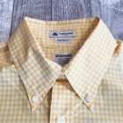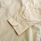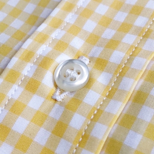【ワーカーズ】 モディファイド ボタンダウン トーマス メイソン WORKERS 定番、Modified Fit のボタンダウン。 身頃、フィット感はあるがピタピタでは無い。肩幅も落ちすぎず、入りすぎず。着丈は裾を出しても・入れても着られる75センチ程がマスターサイズ。袖ぐりのカマ(縦方向の寸法)自体はある程度余裕があり、窮屈さは無い。でも肘から先をわずかに細くしてすっきりと。その分、袖がまくりづらくなるので、袖口の開きは深めにとる・・・といったように、機能性を考えて型紙をひいています。「デザイン的なシャツ」では無く、「設計的なシャツ」とでもいうのでしょうか。型紙を自分でひくからこそ、こういう作り方の品番もあるのです。 2023秋冬のスペシャル品番、トーマスメイソンのポプリン生地を使用したイエローギンガムチェックのボタンダウンシャツです。
