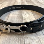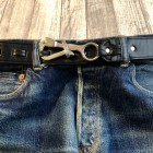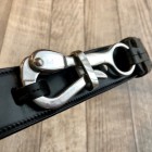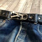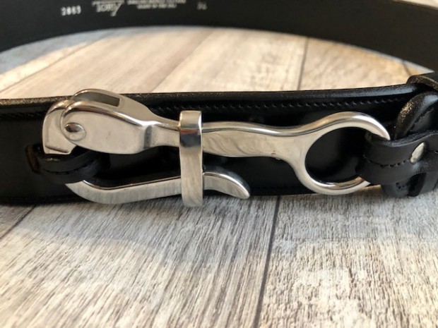 【トリーレザー】 ペリカンフックベルト ブラック / ニッケル TORY LEATHERは1976年創業のアメリカはペンシルバニア州、ウィリアムスポートにて操業した馬具メーカー。アメリカ産の良質なブライドルレザーを使用し馬具、バッグ、ベルトなど自社工場にて熟練の職人の手によって製造されています。アメリカ生産にこだわり続けているメーカーです。 こちらは日本では見かけないフックをループに通して固定するベルト。ベルト幅は約4センチ。ジーンズなどに使用できるがっしりとしたベルトです。ブラックのブライドルレザーにペリカンフックの組み合わせが独特な雰囲気を醸し出してくれます。 MADE IN USA