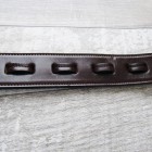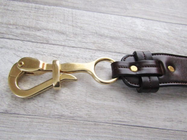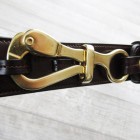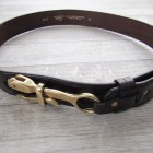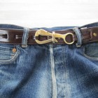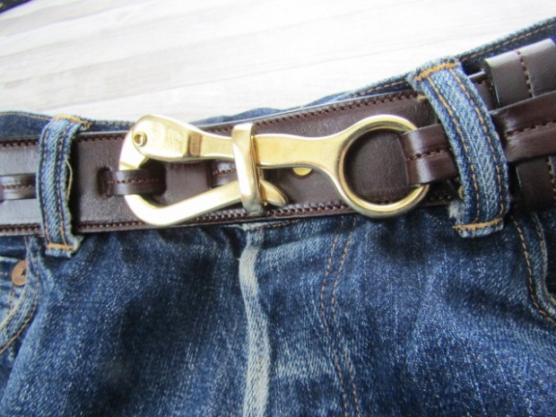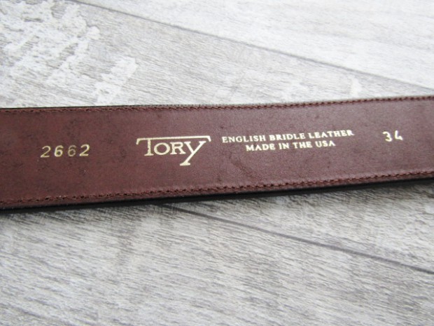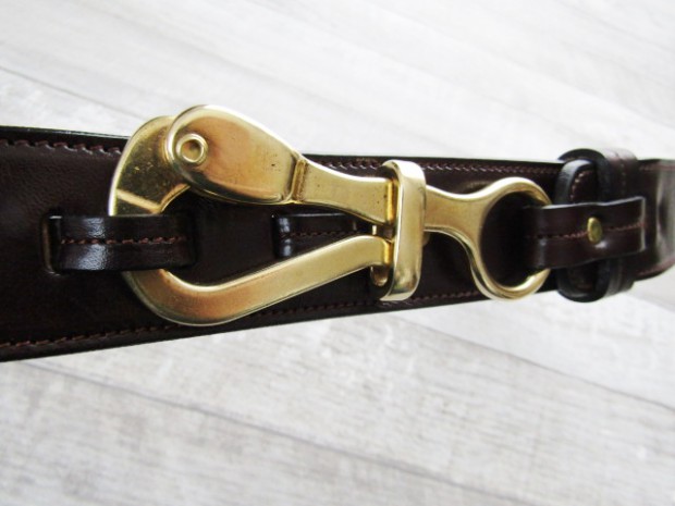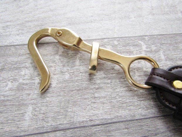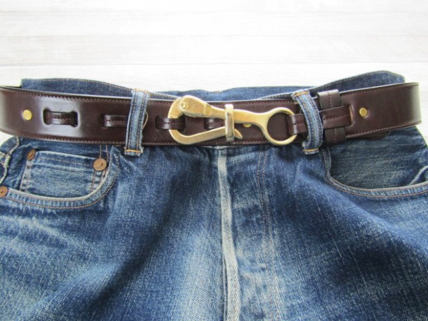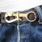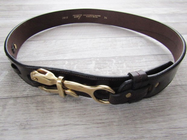 【トリーレザー】 ペリカンフックベルト ブラウン / ブラス TORY LEATHERは1976年創業のアメリカはペンシルバニア州、ウィリアムスポートにて操業した馬具メーカー。アメリカ産の良質なブライドルレザーを使用し馬具、バッグ、ベルトなど自社工場にて熟練の職人の手によって製造されています。アメリカ生産にこだわり続けているメーカーです。 こちらは日本では見かけないフックをループに通して固定するベルト。ベルト幅は約4センチ。ジーンズなどに使用できるがっしりとしたベルトです。ブラックのブライドルレザーにペリカンフックの組み合わせが独特な雰囲気を醸し出してくれます。 MADE IN USA