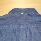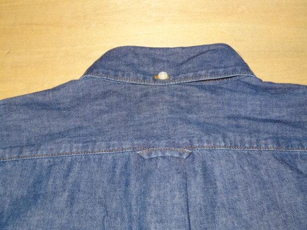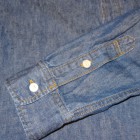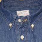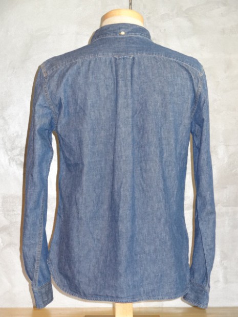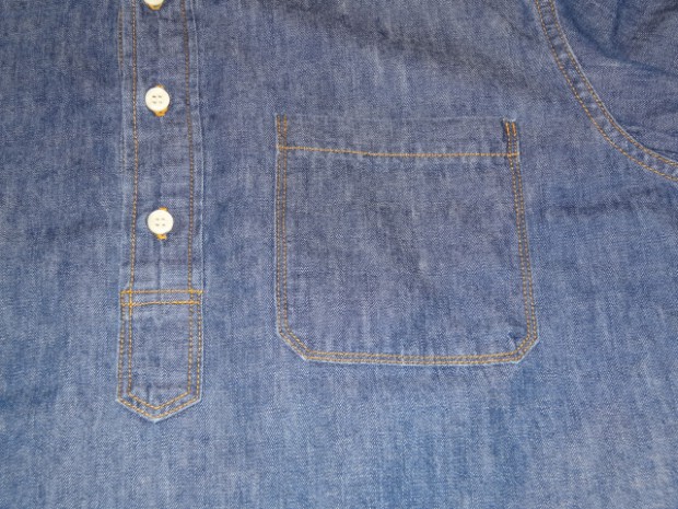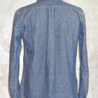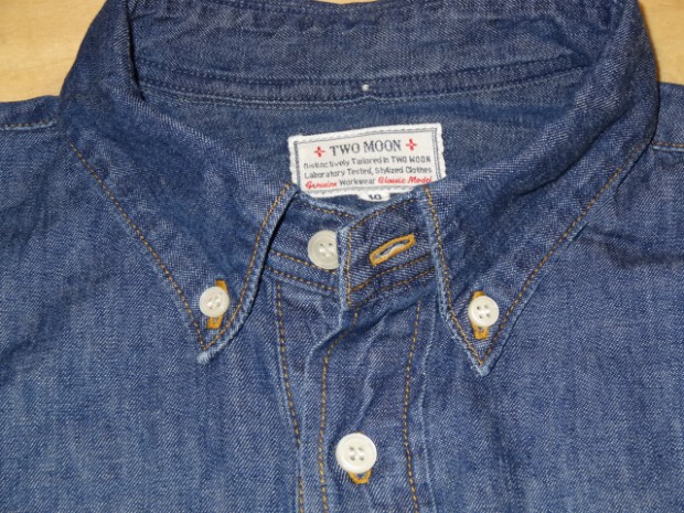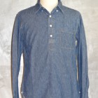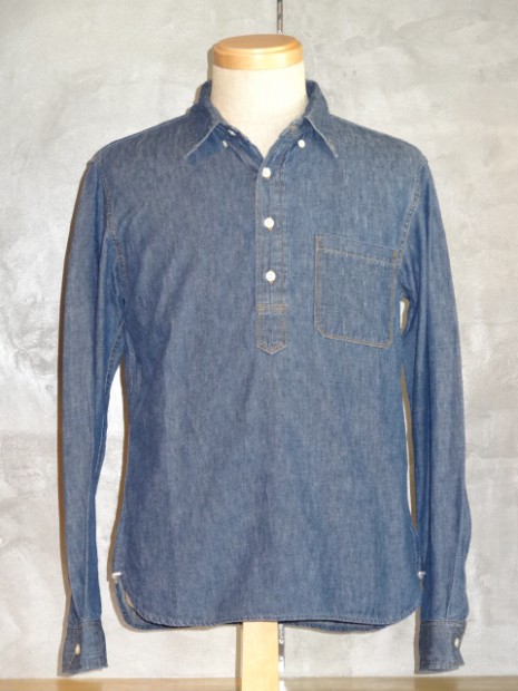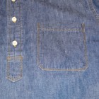 【TWO MOON】 TWO MOONのプルオーバーのダンガリーシャツ。ムラ糸で織り上げられた6.5オンスの生地には独特の風合いが生まれ、きちんとしたデニムの表情を醸しだしながらも手触りは非常に柔らかい。縫製は各部が巻縫いで仕上げられ、細かいピッチで丁寧に縫われている。ボタンダウン・カラーの襟元がフォーマルな雰囲気を醸し出しつつも、裾脇などはきちんと共生地で補強され、各部のディティールはあくまでもワークテイストを踏襲している。