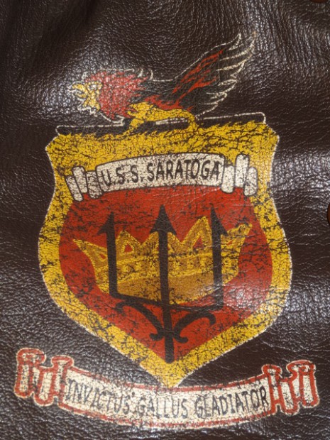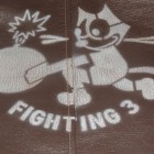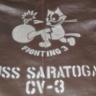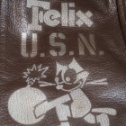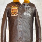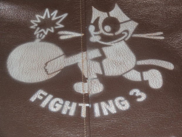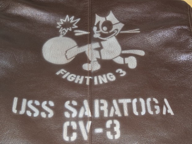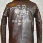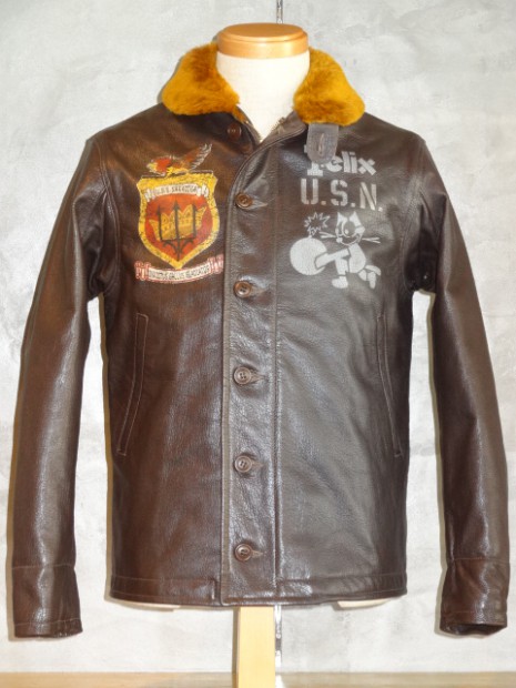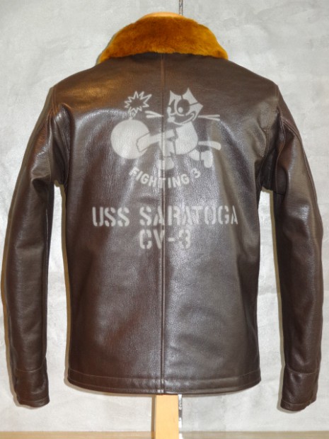 甲板上の作業に従事する海軍兵に支給されたN-1デッキジャケットの素材をジャングルクロスに代わって海軍に馴染みの深いゴートスキンに変換。このトイズマッコイのオリジナルをベースとし、爆弾を抱えるFELIXをマスコットに起用した戦闘飛行部隊、“VF-3”をモチーフにカスタムが施されています。同部隊を搭載した空母サラトガのインシグニアとFELIXを直接革に描いたことで、あたかもヴィンテージのような風合いに仕上げられています。