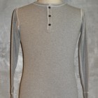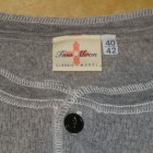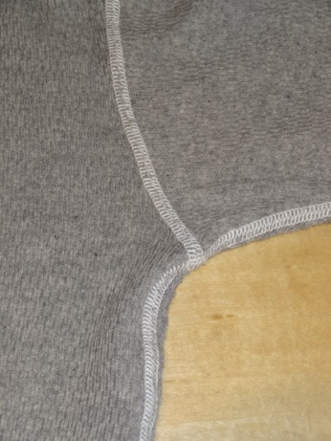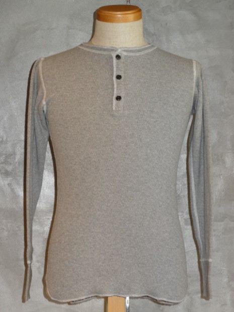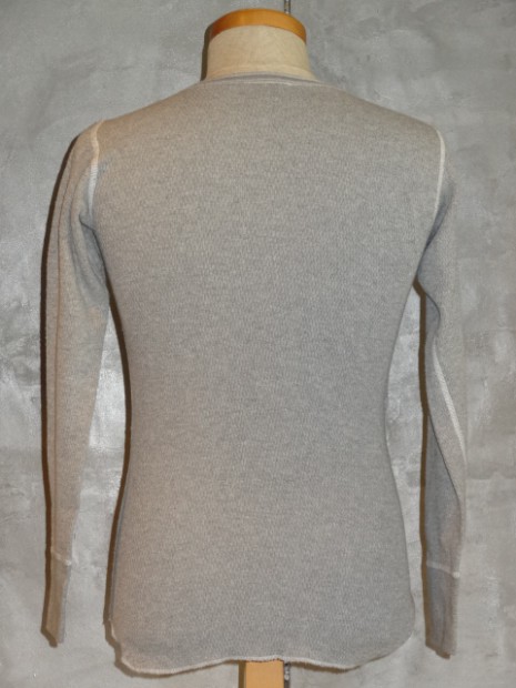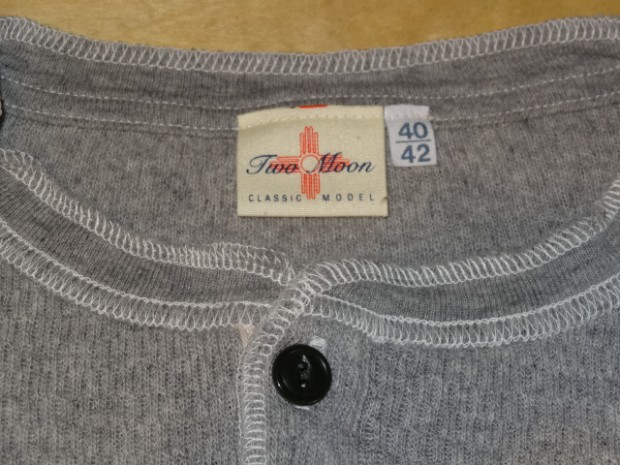 【TWO MOON】 オールドサーマルのヘンリーネックタイプ。首回りを楽に着こなしたい方にオススメです。襟リブのカットオフ&ロック始末、前立ての裏の布帛使いなど、ラフに着こなせるデザインディティールです。シャツやVネックのインナーなど、両Vタイプとはまた違ったコーディネートが楽しめます。