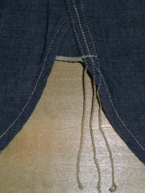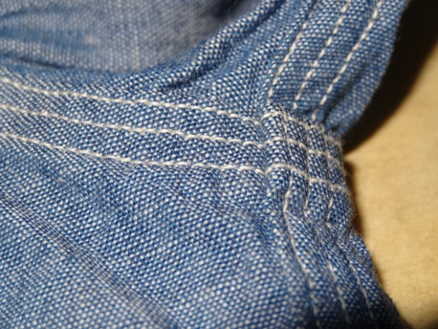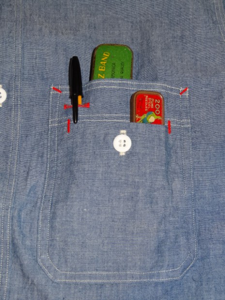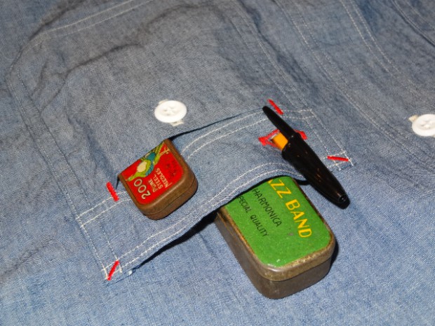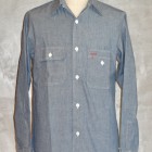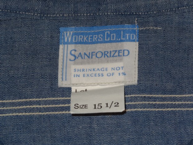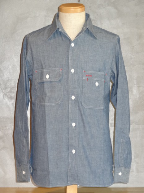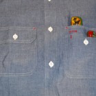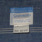 【WORKERS】 BIGYANKと並ぶ特徴的な左胸ポケット。二重構造になり、さらにペンも刺さります。 襟もオリジナルをトレースし、さらに台襟のボタンホール位置が本来あるべき位置よりも少し脇に寄っています。ある意味、シャツの常識からいえばNGなのですが、今回は出来る限りオリジナルに忠実にということであえて再現しています。 ボタンは皿型の尿素ボタン。ここもあえてベタに左胸ポケットも金属ボタンは使わずすべて尿素ボタンにしました。 縫製はおなじみの巻き縫い+フロントは前立て縫いミシンを使ったもの。左胸ポットの4本ステッチも前立てと同じセッティングのミシンで一気に縫っています。 シャンブレーは定番の中厚。洗えば洗うほど柔らかく、色も徐々に落ちていくものです。 洗い済製品をお送りします。