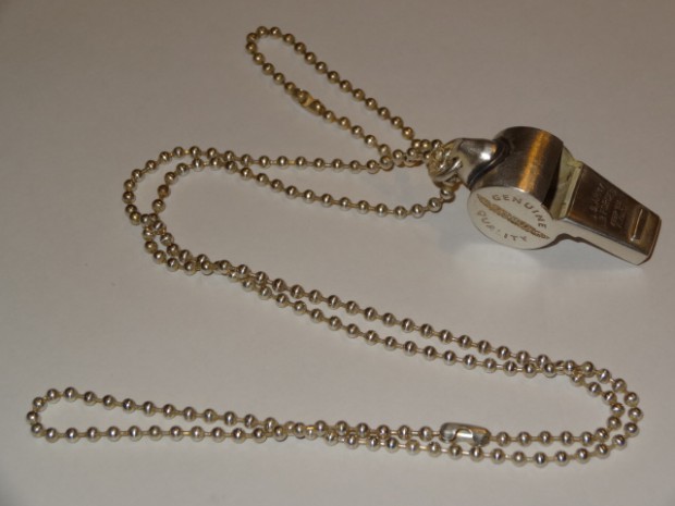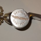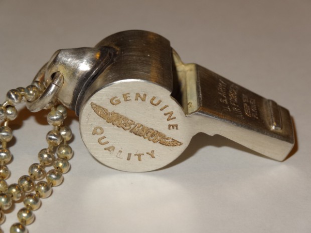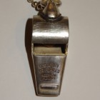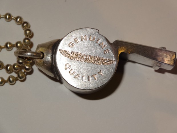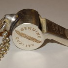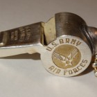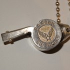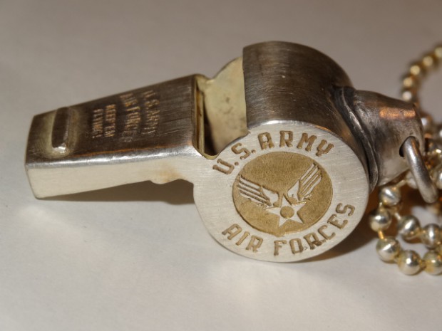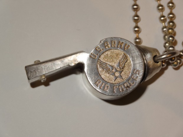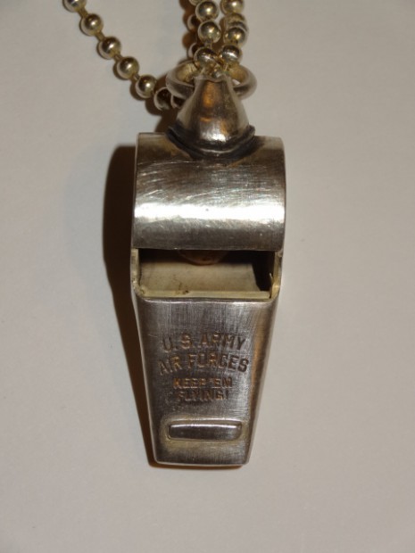 【TOYS McCOY】 第2次大戦時に撮られた飛行兵のスナップ写真にはA-2のネックフックにホイッスルを装着している例が多く存在する。今回モデルアップしたのはそのホイッスルをベースにオリジナリティを加えたもの。真鍮に純銀メッキを施し、その上から右側面にU.S.AIR FORCESの文字とウィング&スターを削るという手の込んだ手法を採用。また左側面にはトイズマッコイのカンパニーロゴ、上部にはU.S.AIR FORCESとKEEP 'EM FLYING! の文字も同様に打刻。同素材のチェーンが付属する。