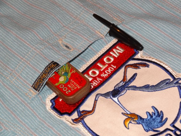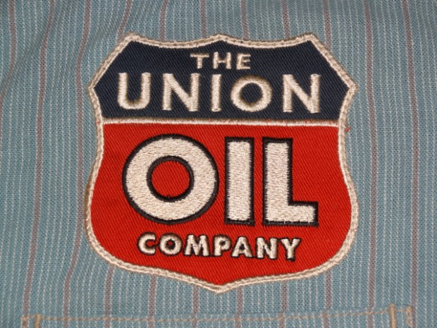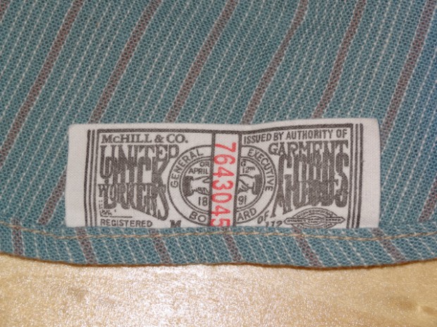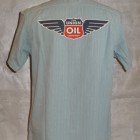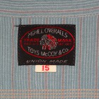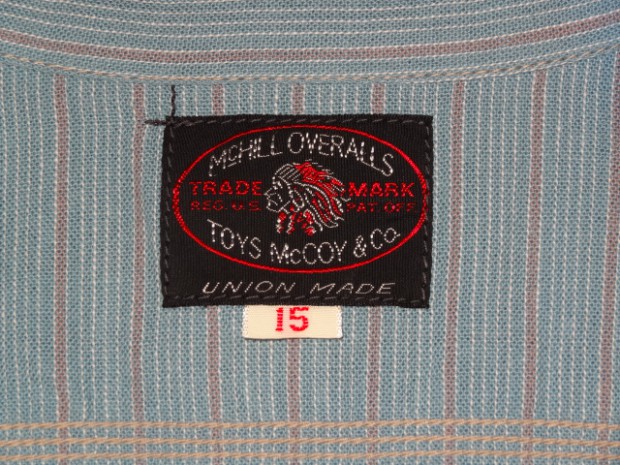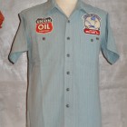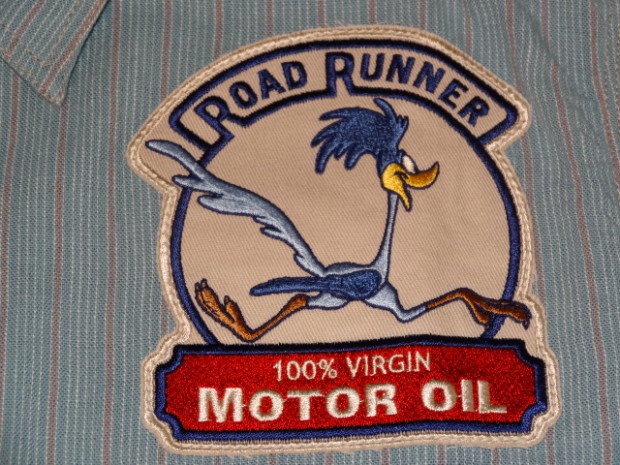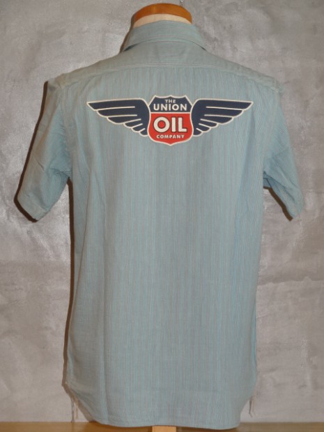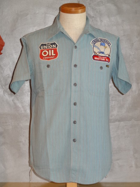 【TOYS McCOY】 ルート66を巡る長旅にはエンジンオイルの交換が必要不可欠だった。街道沿いには消耗パーツやケミカルグッズを扱い、整備を請け負うショップが数多く存在した。その当時の情景に想いを巡らせながらショートスリーヴのストライプワークシャツをカスタム。俊敏にオーダーに応えることからルーニーテューンズのロードランナーを起用したとという架空のカンパニーロゴを左胸に配置した。ストライプが美しいシャツはしかし、油で汚れてこそ、その魅力を発揮するのである。