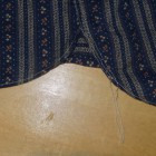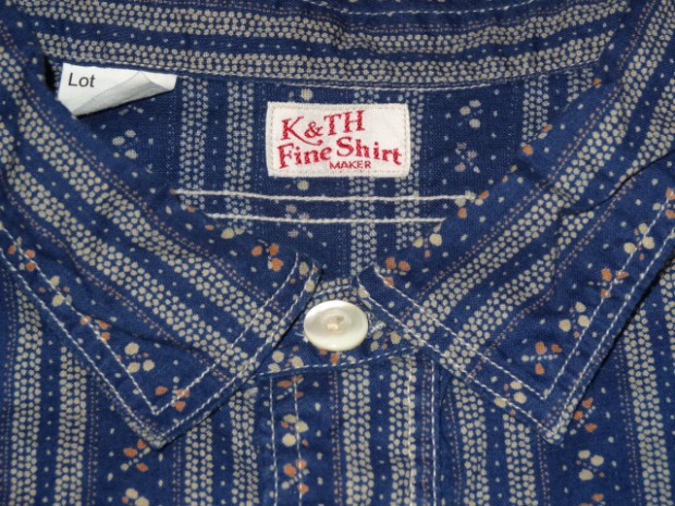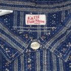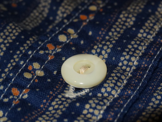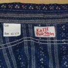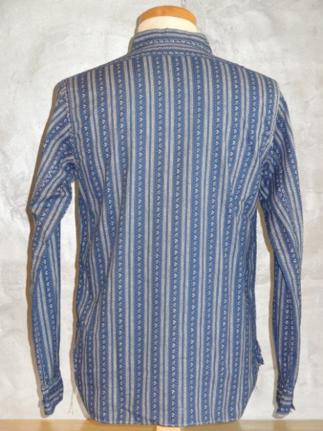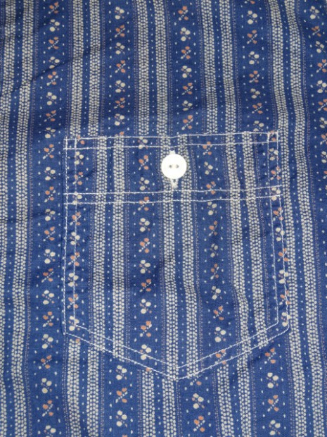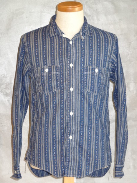 【WORKERS】 インディゴ染めした生地を抜染、さらにプリント。この技法を「着抜」と呼びます。今回のように、部分的に色が抜けたところ、さらにプリントが入るところと二つ版が必要で、これをずれないようにローラーで刷るのは中々難しいそうです。実際、最初に作った見本は版がずれました。 その生地でシャツを作り、ワンウォッシュしています。 元にした生地はアメリカに行ったときに見た着抜生地がイメージ。 Washedとは違い、加工をしていないので生地に負担がかかっていないので、長く着られます。