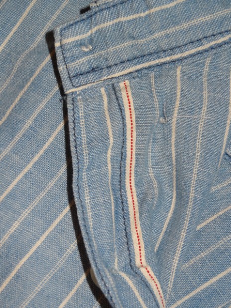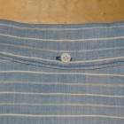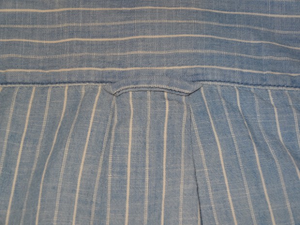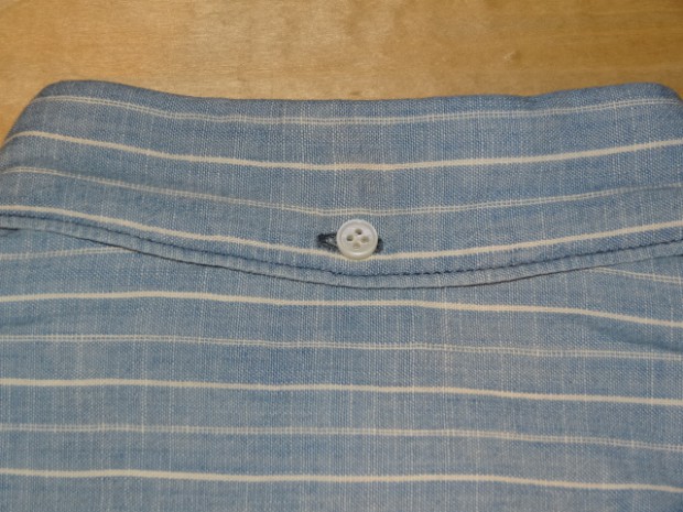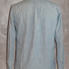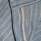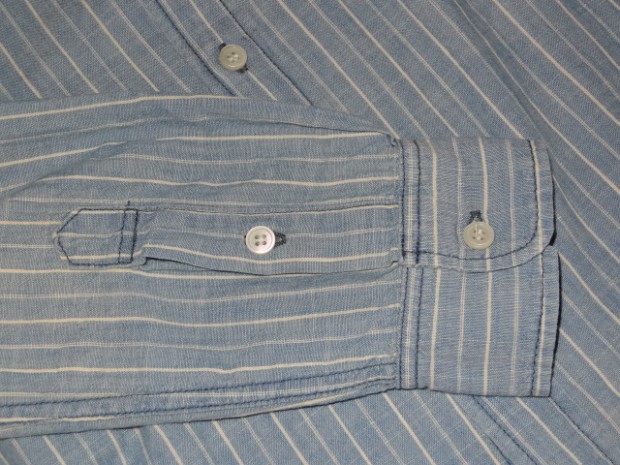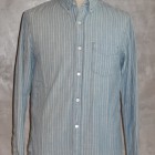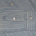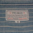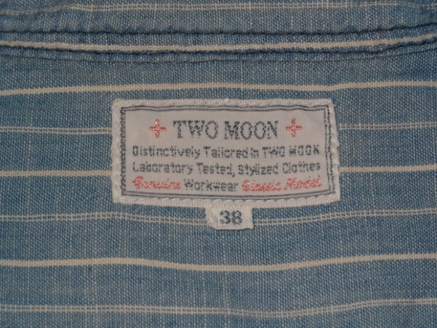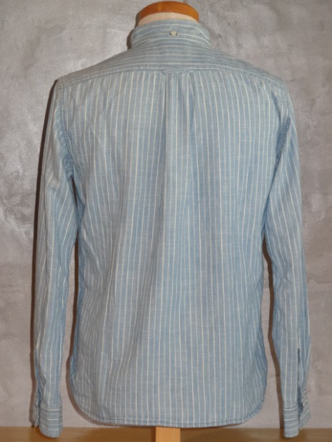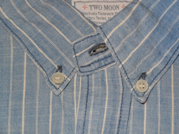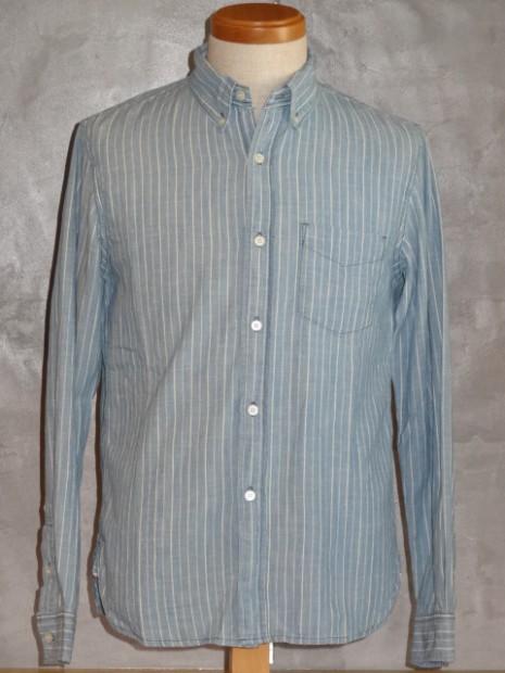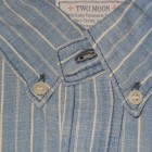 【TWO MOON】 細い巻縫い、ベーシックな台襟や糸使いなど随所にワークテイストを盛り込んだボタンダウンシャツ。縦糸にインディゴ糸と生成りの糸を使用したストライプシャンブレーに製品加工で薄いベージュをオーバーダイし、全体を馴染ませています。結果、風合いも軽くやわらかで夏の羽織りものにはもってこいの仕上がりになりました。
