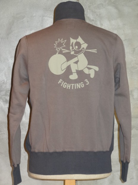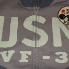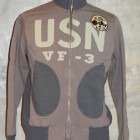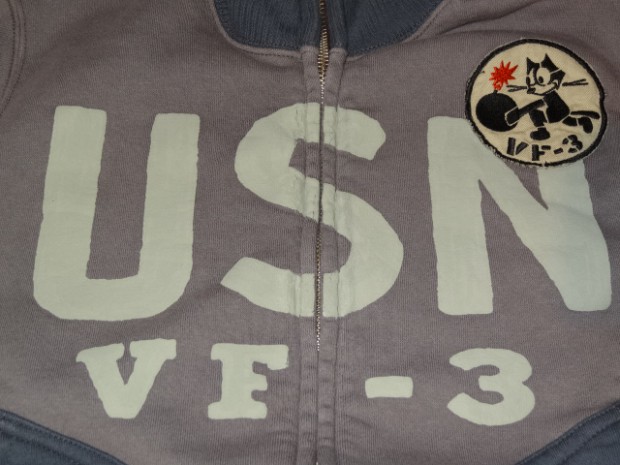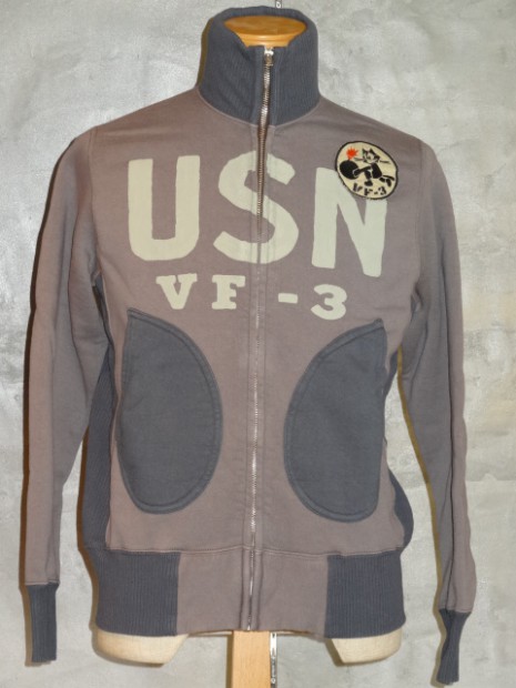 【TOYS McCOY】 アウタートして、またレイヤードアイテムとして重宝するフルジップスウェット。デザインは米海軍の傑作品、ショート丈のデッキジャケットを模しており海軍飛行部隊、VF-3のデコレーションを施してあります。D型のパッチポケットやスタンドカラーの襟を踏襲し、脇の下にリブパネルを設けたことで運動性にも優れています。