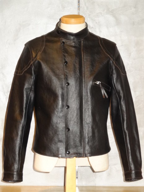 【TOYS McCOY】 マックィーンのプライベートなワードローブの中で一際無骨さを醸し出すモーターサイクルウェア。トライアンフTR-6を操り、ハリウッドでの肩書とは別次元の、男の世界を駆け抜けたレーシングジャケットを北米産マスタングハイドを用いて完全復刻。希少なオフショットを解析し、裏地から細かなディティールにいたるまで、伝説の男のライディングシーンを蘇らせました。