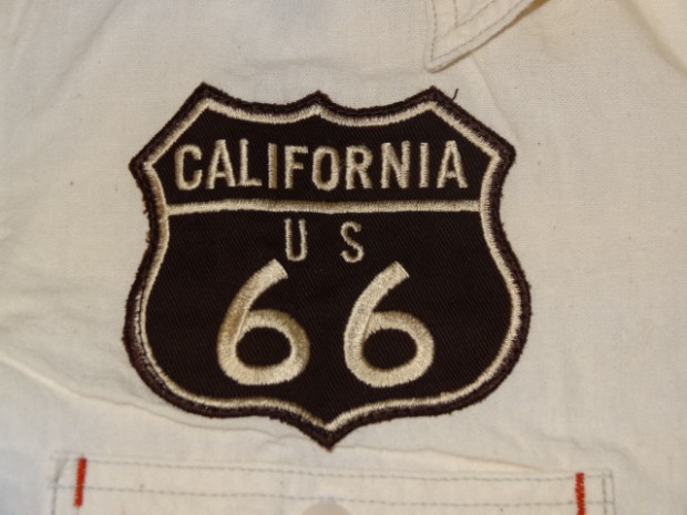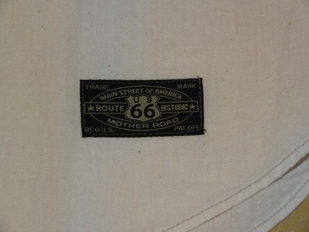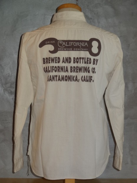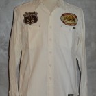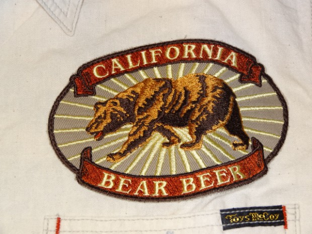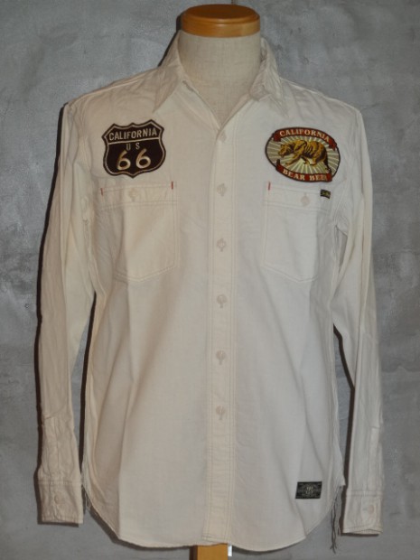 【TOYS McCOY】 独特な生地感が特徴のホワイトシャンブレーをベースに、ルート66のアイコンをあしらったカスタムシャツ。オールドスタイルのボトルオープナーをモチーフにしたデザインは、かつてカリフォルニアに存在していたかのような架空のカンパニーロゴ。その名はBEAR BEERで、カリフォルニア州旗のグリズリーベアとビールをかけ合わせたダブルミーニング。