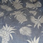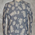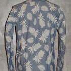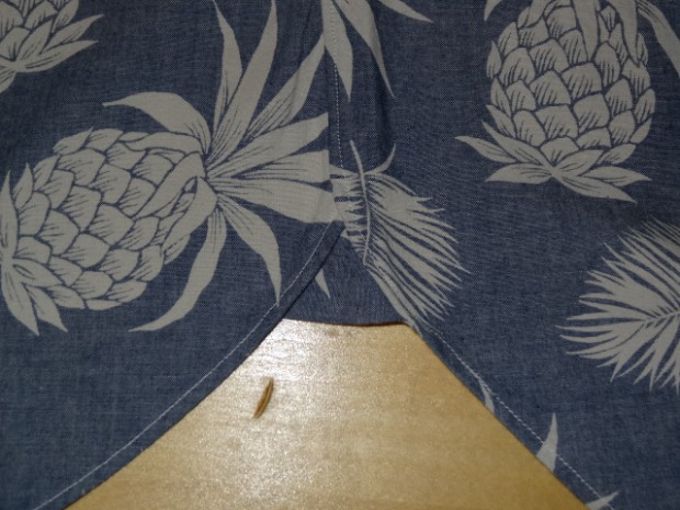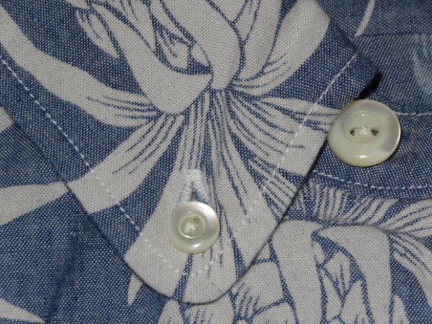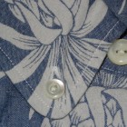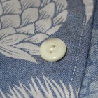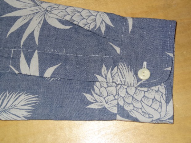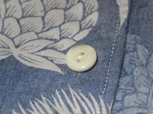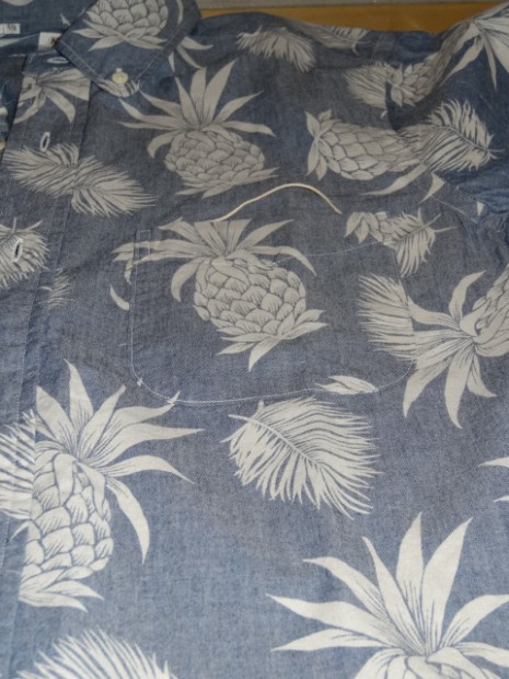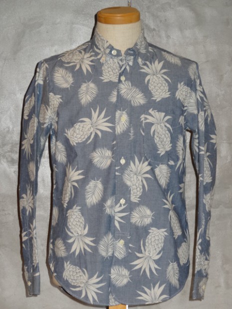 【WORKERS】 せっかく春夏なので一つぐらい遊びのある素材を。という事で、シャンブレーに抜染でパイナップルを描いた柄を選びました。 顔料などを乗せるプリントではなく色自体を抜いているので、表面にがさつきがありません。またシャンブレー自体も比較的、糸が細くしなやかな物なので少しドレスよりの形との相性も良いです。 身頃はフロントラウンド型、バックタックのベーシックな物。襟が特徴で、四角い襟の角を丸みで取ったミニラウンドカラーのボタンダウン。 同じ「ラウンドカラー」でも、ポルカドット等で良く使う丸みの強いもの と比較すると違いが良くわかります。 普通のBDとはちょっと違う、でも丸みの強いラウンドはちょっとクラシカル過ぎて苦手という方にお勧めします。 ワンウォッシュ済の製品をお送りします。